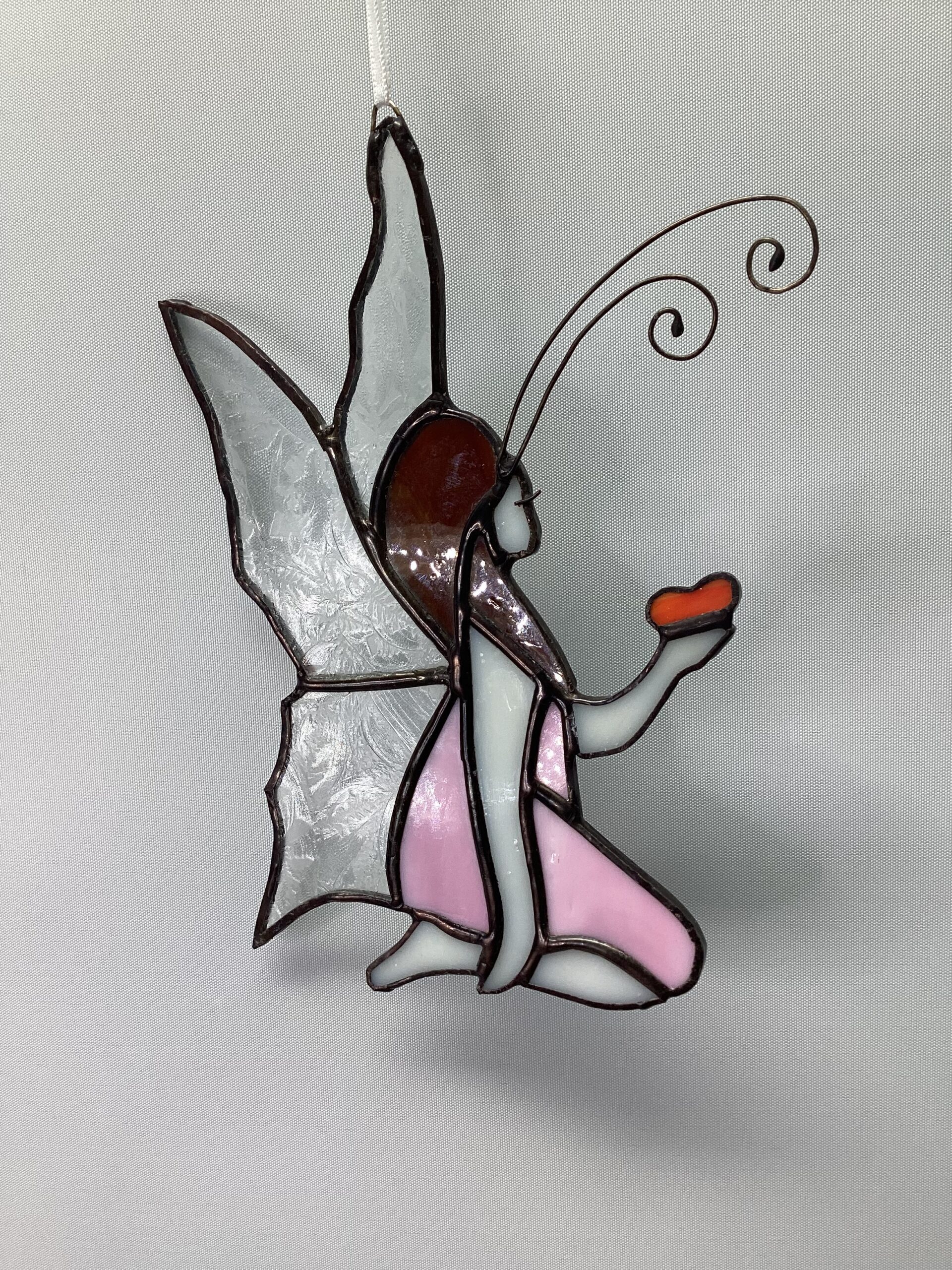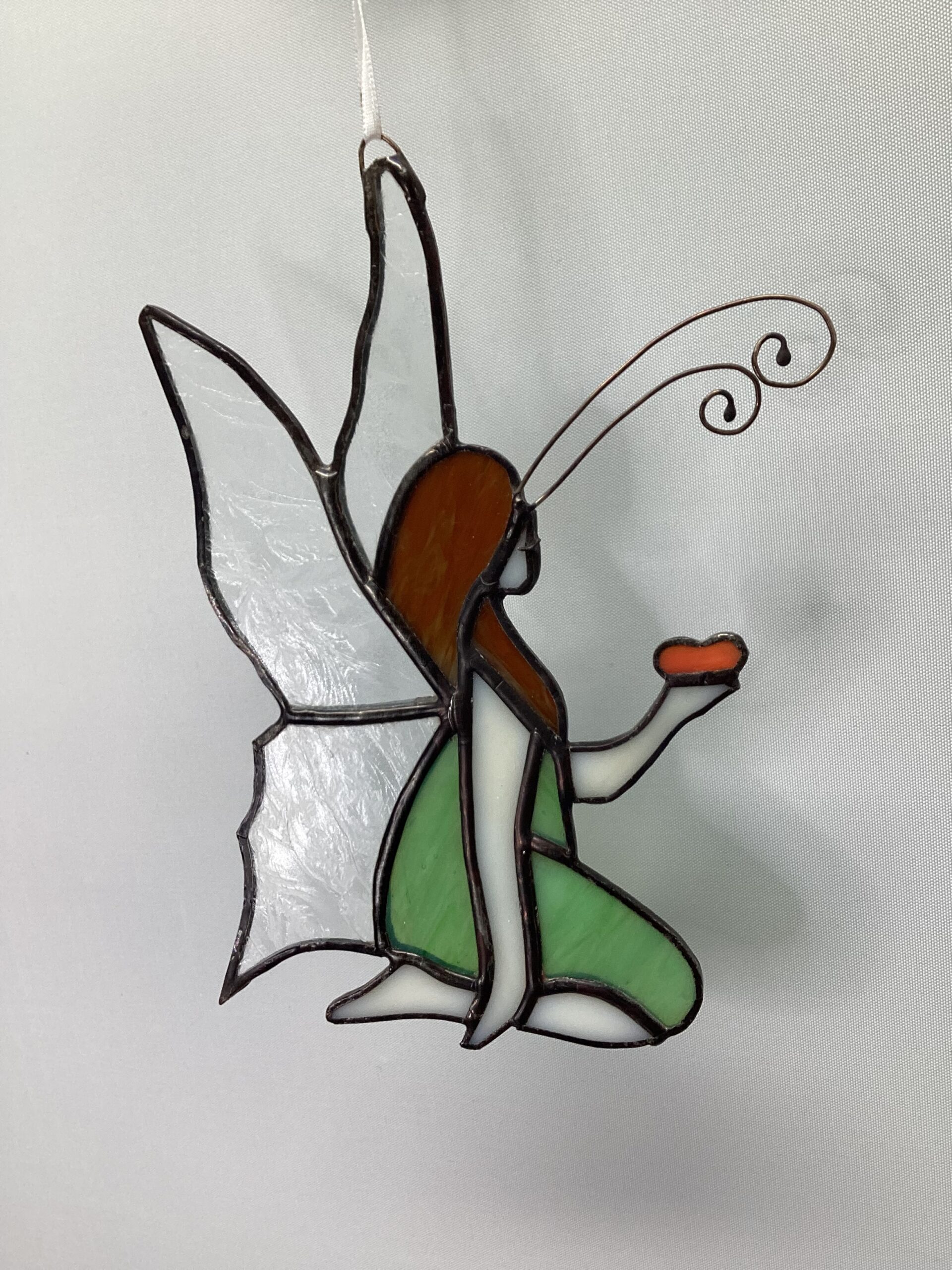 Deze glasinlood knielende groen engel hanger met pastel glas kleuren vleugels lijkt wel een engel uit een winter sprookje. Dit unieke tiffany exemplaar is volledig handgemaakt. Leuk voor de een speciale gelegenheid en uw engel een mooi glasinlood kado te geven. Hangend in de kerstboom of als raam of deurhanger brengt deze engel licht in uw woonkamer.