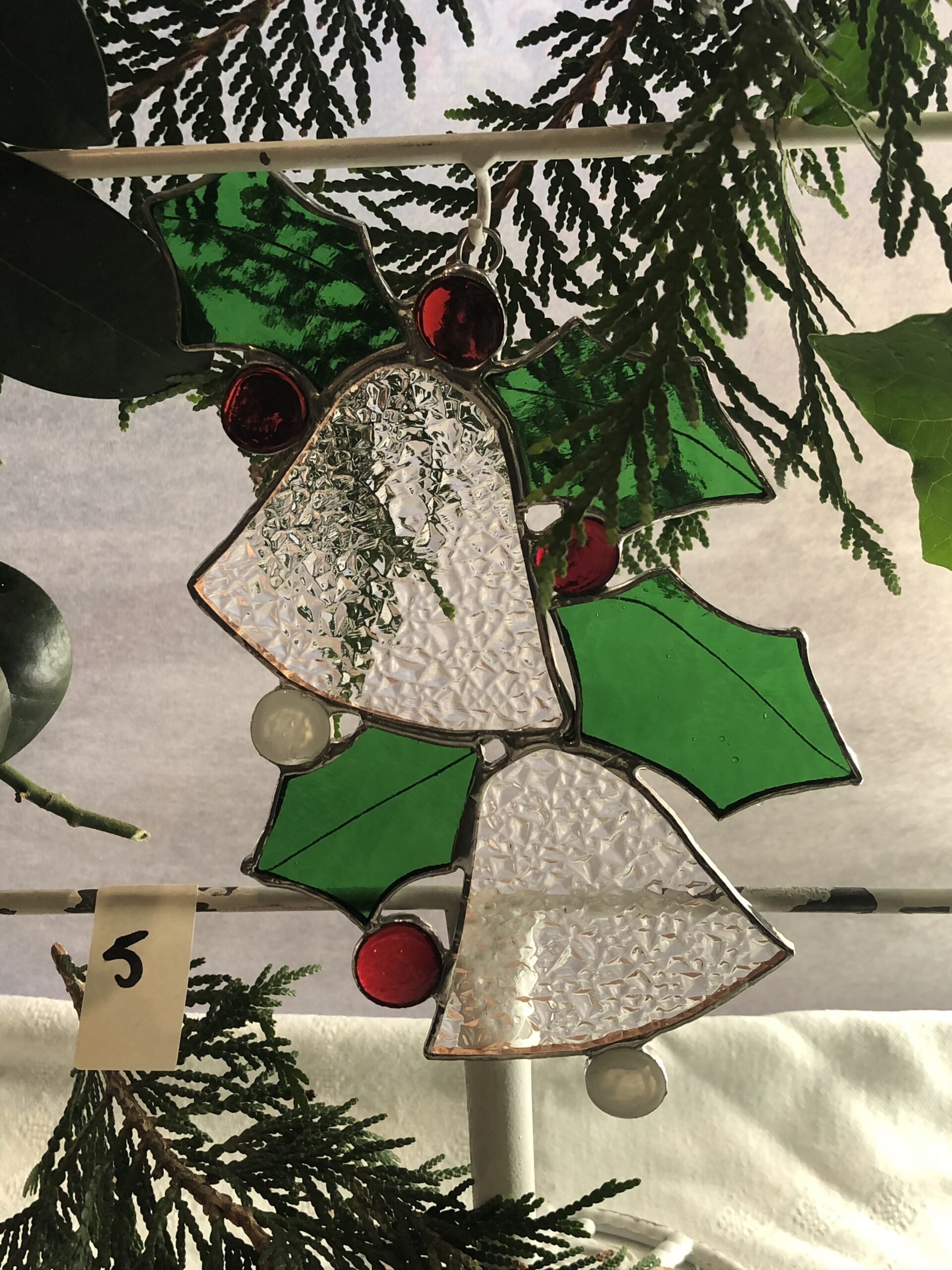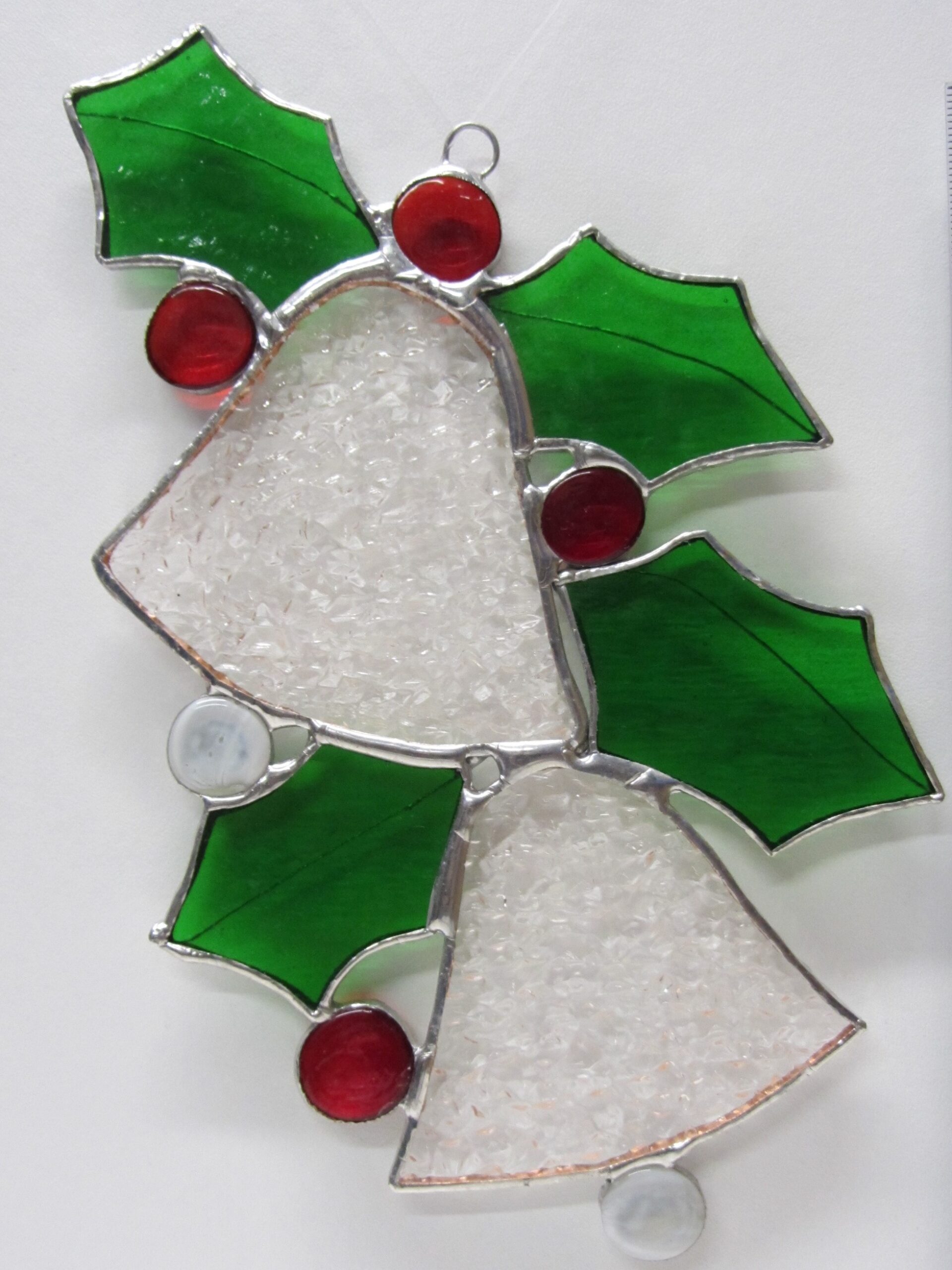 Glasinlood kerstklokken hanger. Een uniek tiffany exemplaar. Volledig handgemaakt in prachtige kleuren met twee klokken. Deze mag niet ontbreken bij u in de huiskamer. Kan ook mooi gebruikt worden als raam of deurhanger. Elk exemplaar is net weer even iets anders.