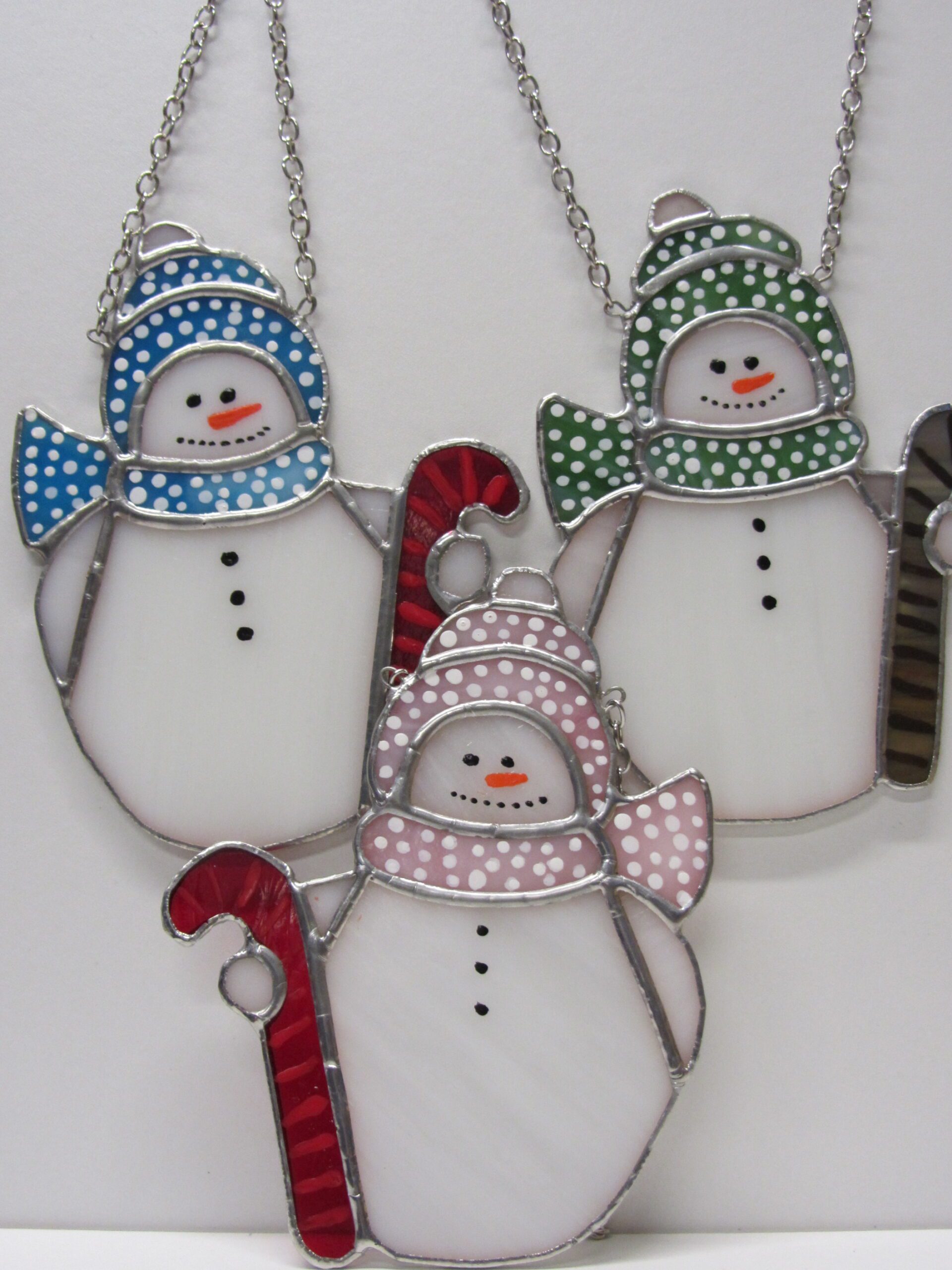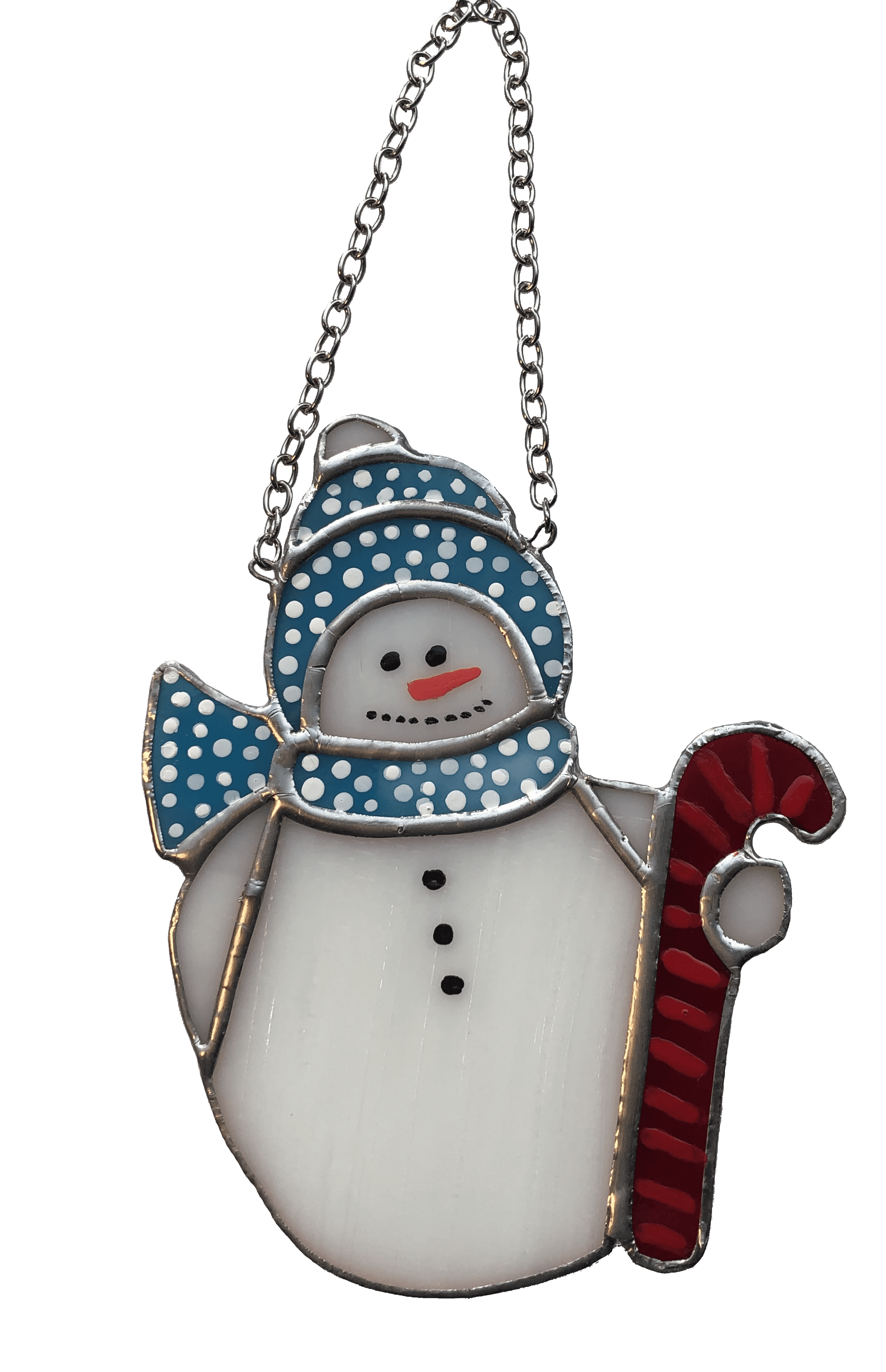 Glasinlood sneeuwpop hanger. Er is er maar één van iedere kleur. Dit unieke tiffany exemplaar heeft een blauwe muts en sjaal. Volledig handgemaakt. Een glas in lood kado voor de winterdagen of kerst. U kunt de sneeuwpop ophangen als raamhanger. We hebben er ook één met een roze en een groene muts.