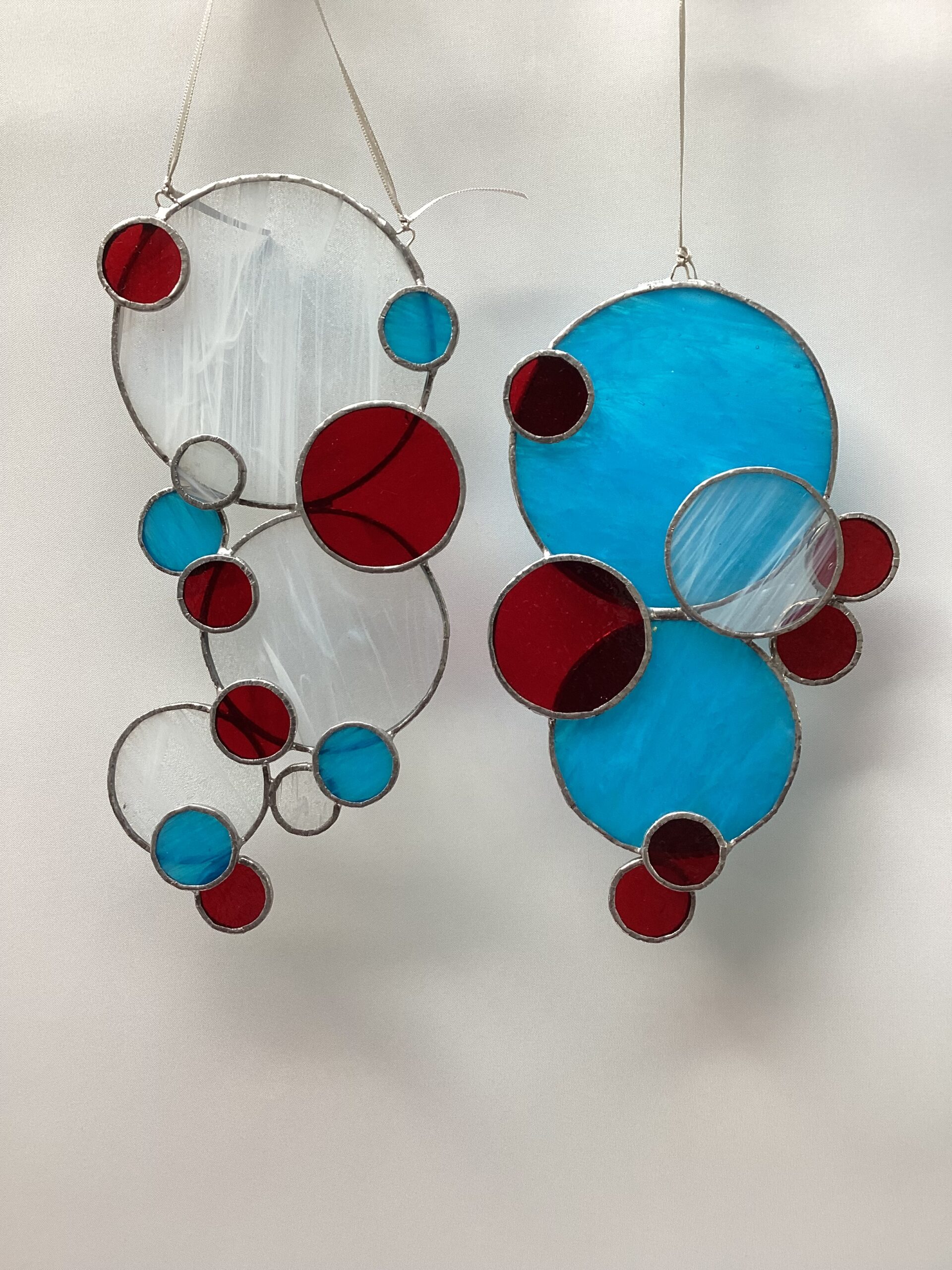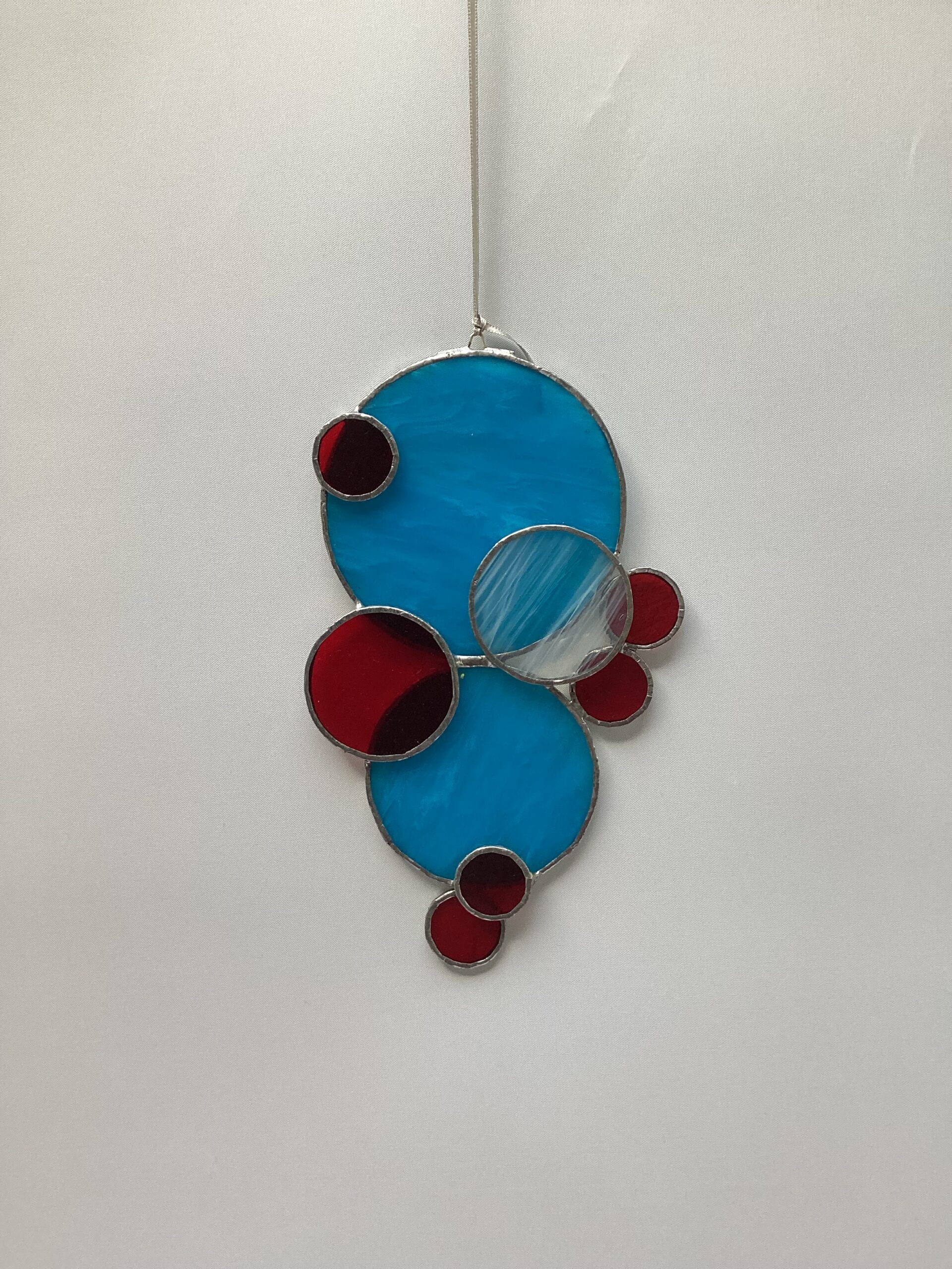 Een abstracte hanger bestaande uit blauwe, rode, witte cirkels. Een mooie aanwinst voor een raam.