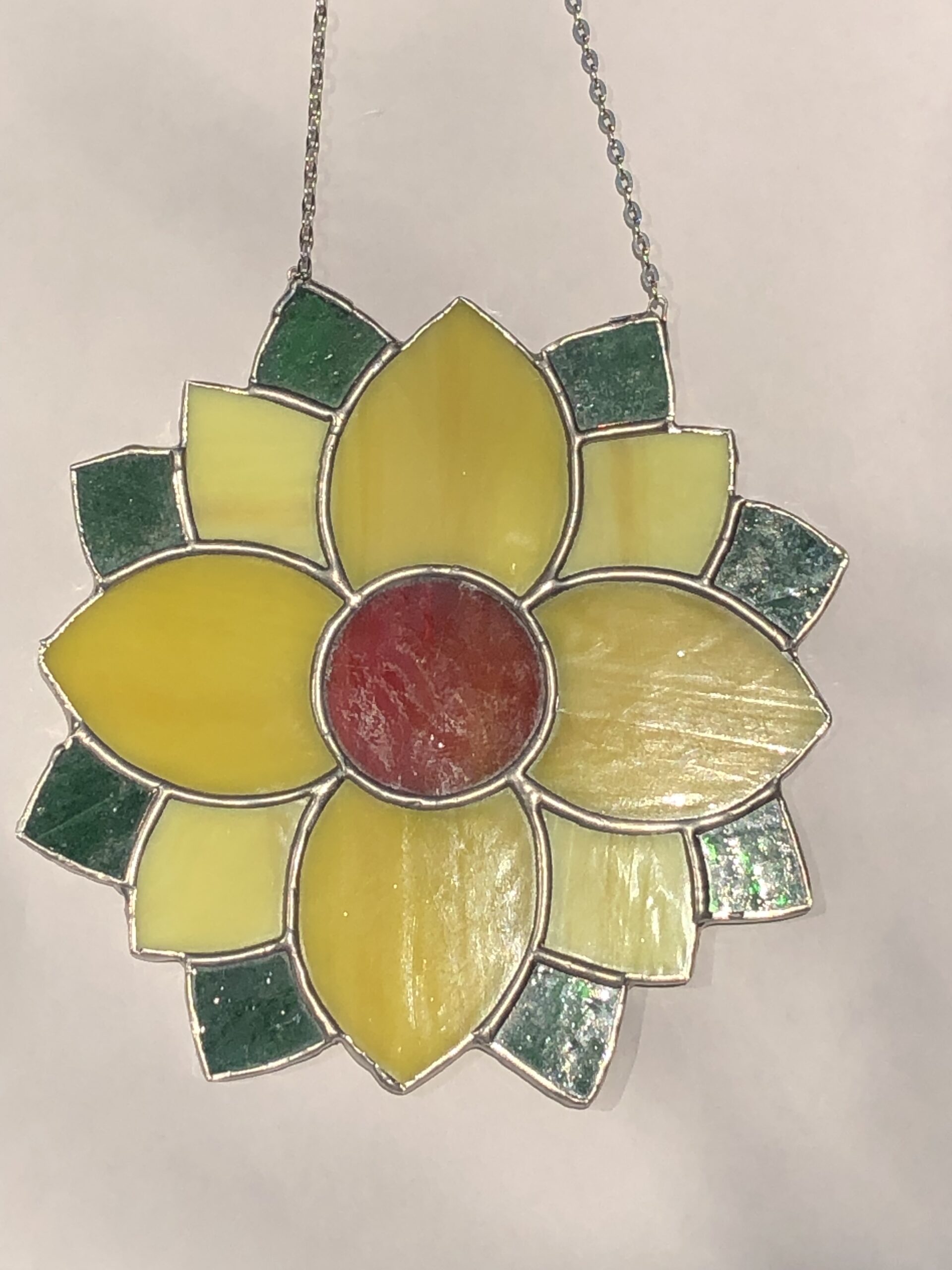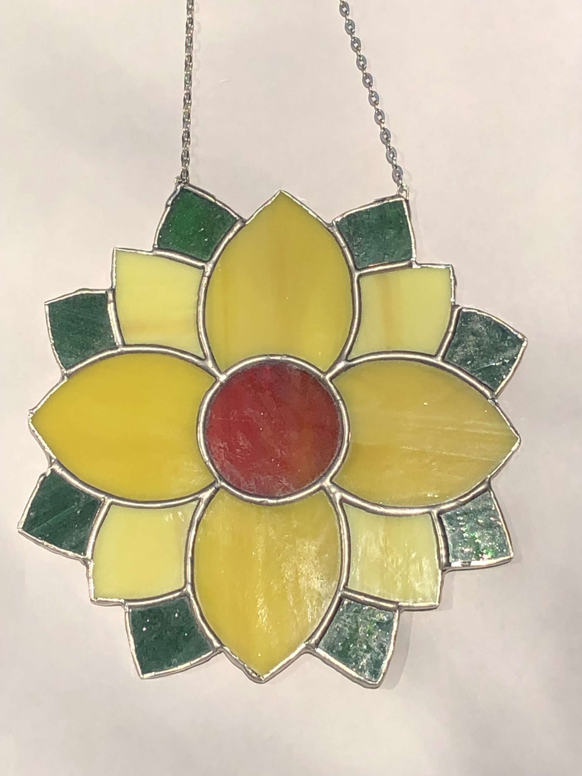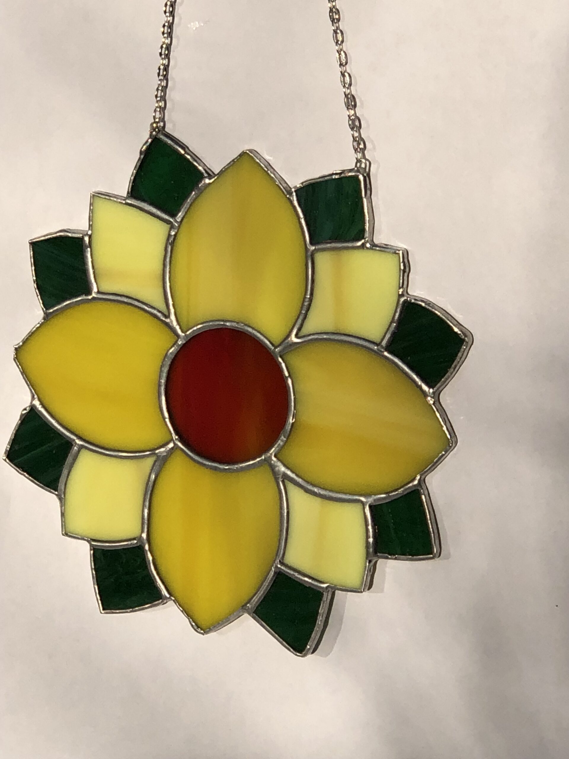 Een glasinlood gele zonnebloem als zonnige blikvanger bij u in huis als raamhanger, daar wordt je echt vrolijk van.