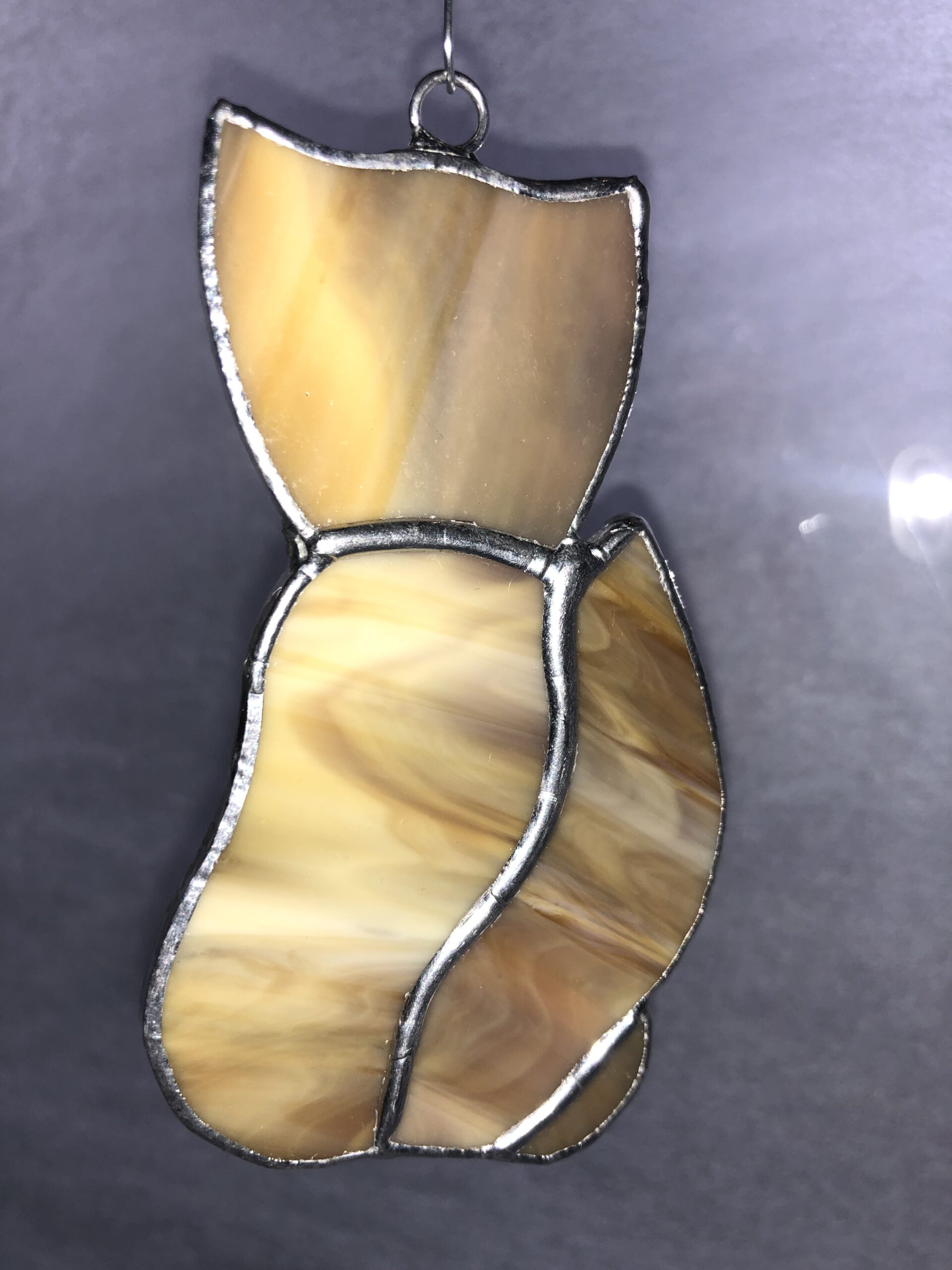 Glasinlood goudbruine kat met staart in het zelfde vlak. Een glasinlood tiffany kado voor een verjaardag of een relatie met katten of poezen als huisdier. Uw favoriete glasinlood kat met een unieke goud bruine kleur in uw huis als deur of raamhanger. We hebben meerdere kleuren katten in de webshop. Pas op de kat.