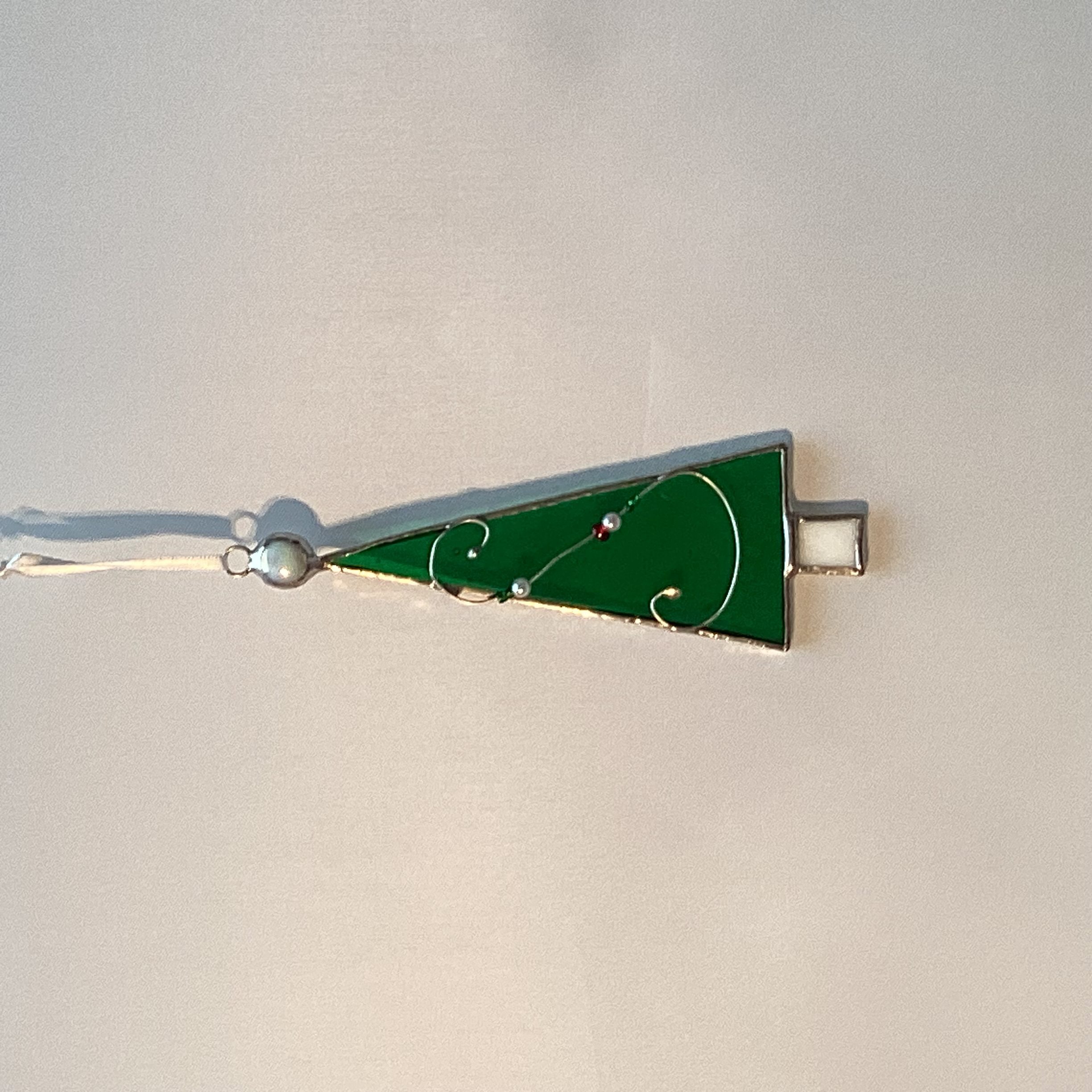 Glasinlood Groene Kerstboom met kralen. Een mooie groene kerstboomhanger met slinger en bal in de top. Een uniek handgemaakt glasinloodkado voor de feestdagen. Wij hebben meerdere soorten en kleuren kerstbomen in onze glasinloodkado webshop.
