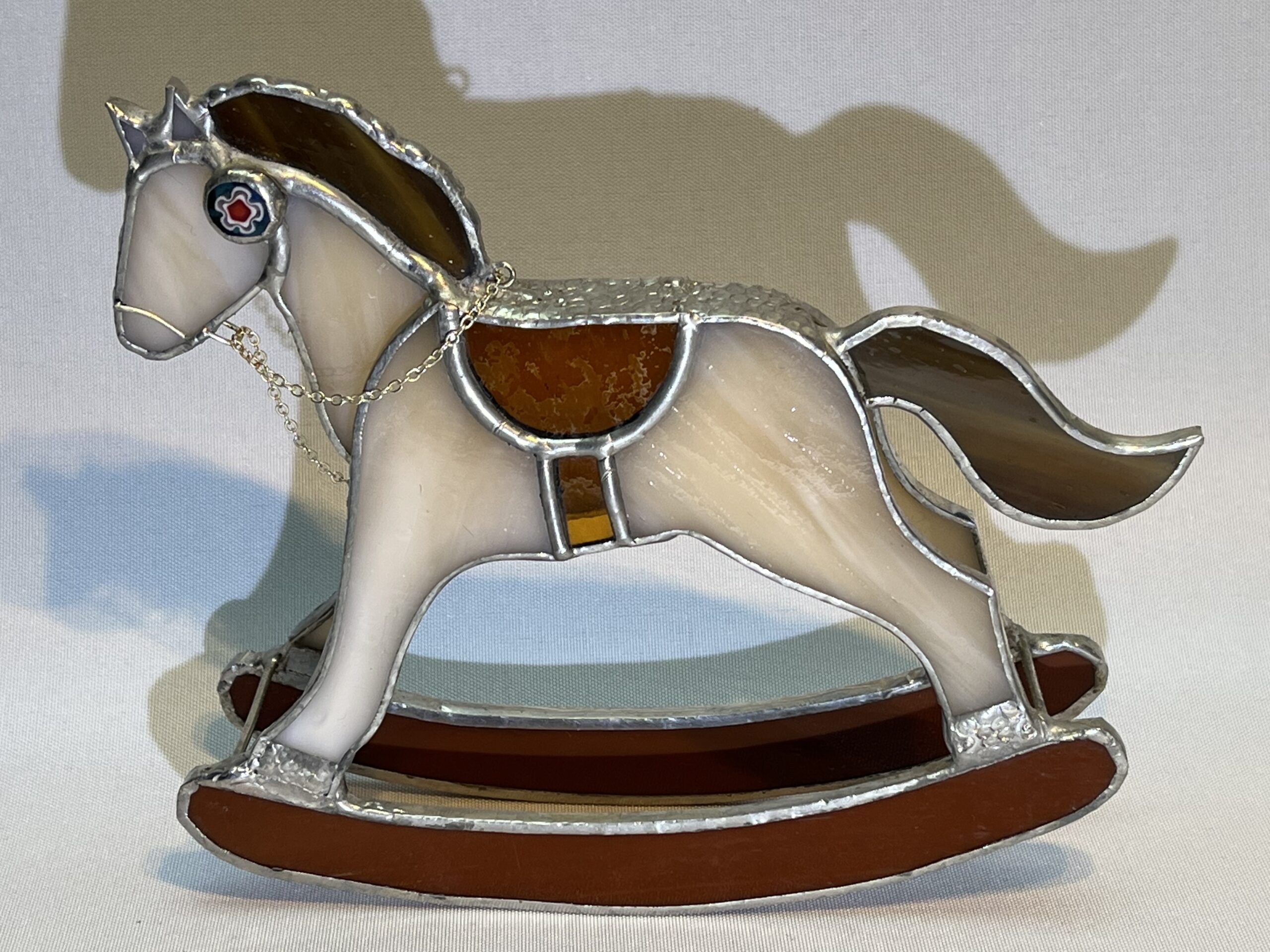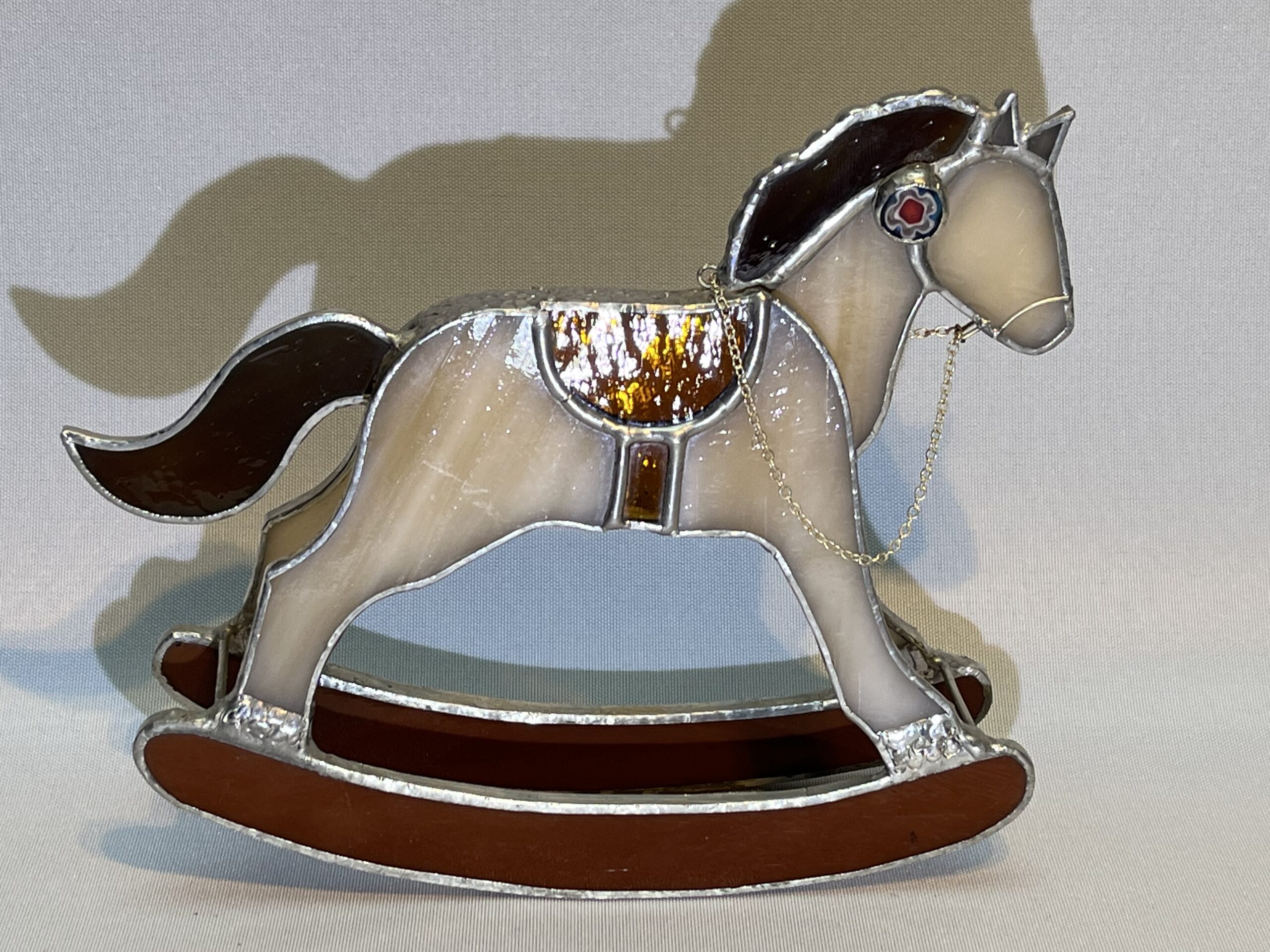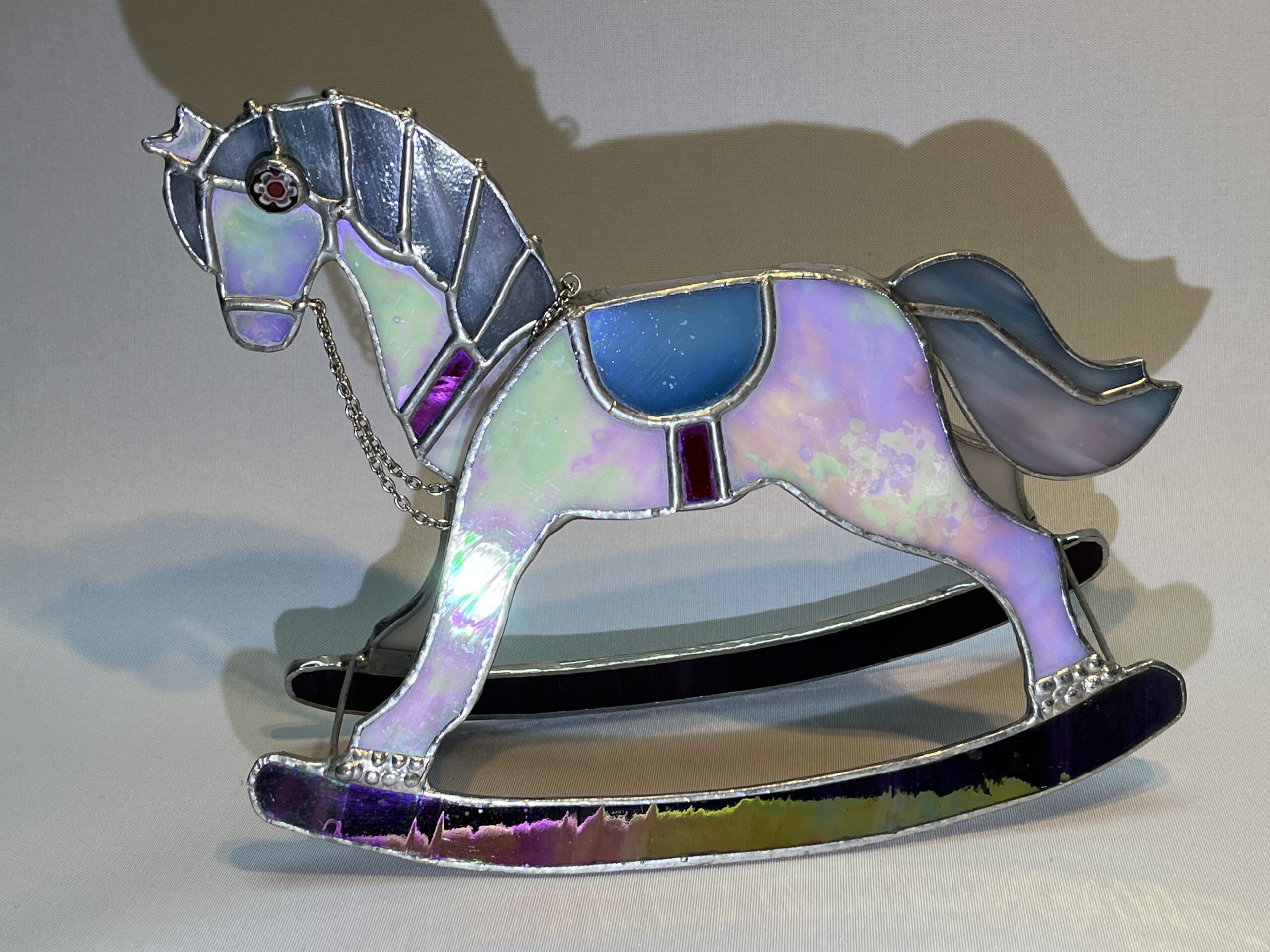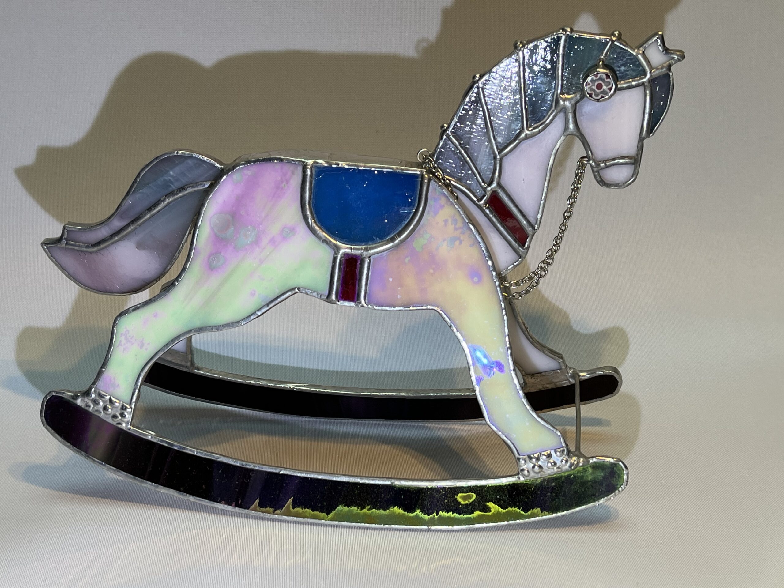 Glasinlood Hobbelpaard groot. Prachtig parelmoer roze hobbelpaard, met mooie manen en teugels en mooi versierde rozet op zijn hoofd en een 2 kleurige staart. Een blikvanger in de kinderkamer of als origineel glas in lood kado voor Sinterklaas feest.
