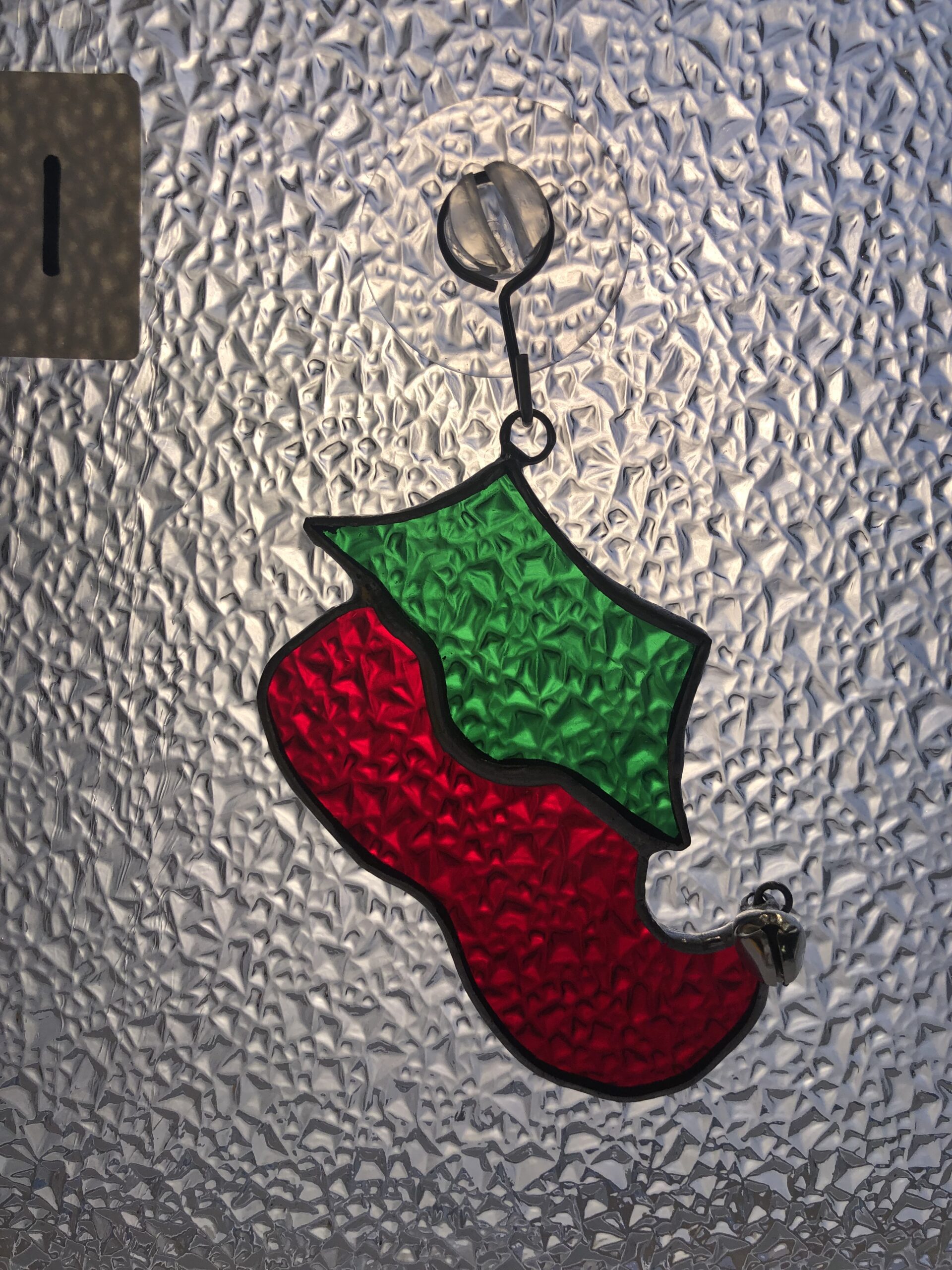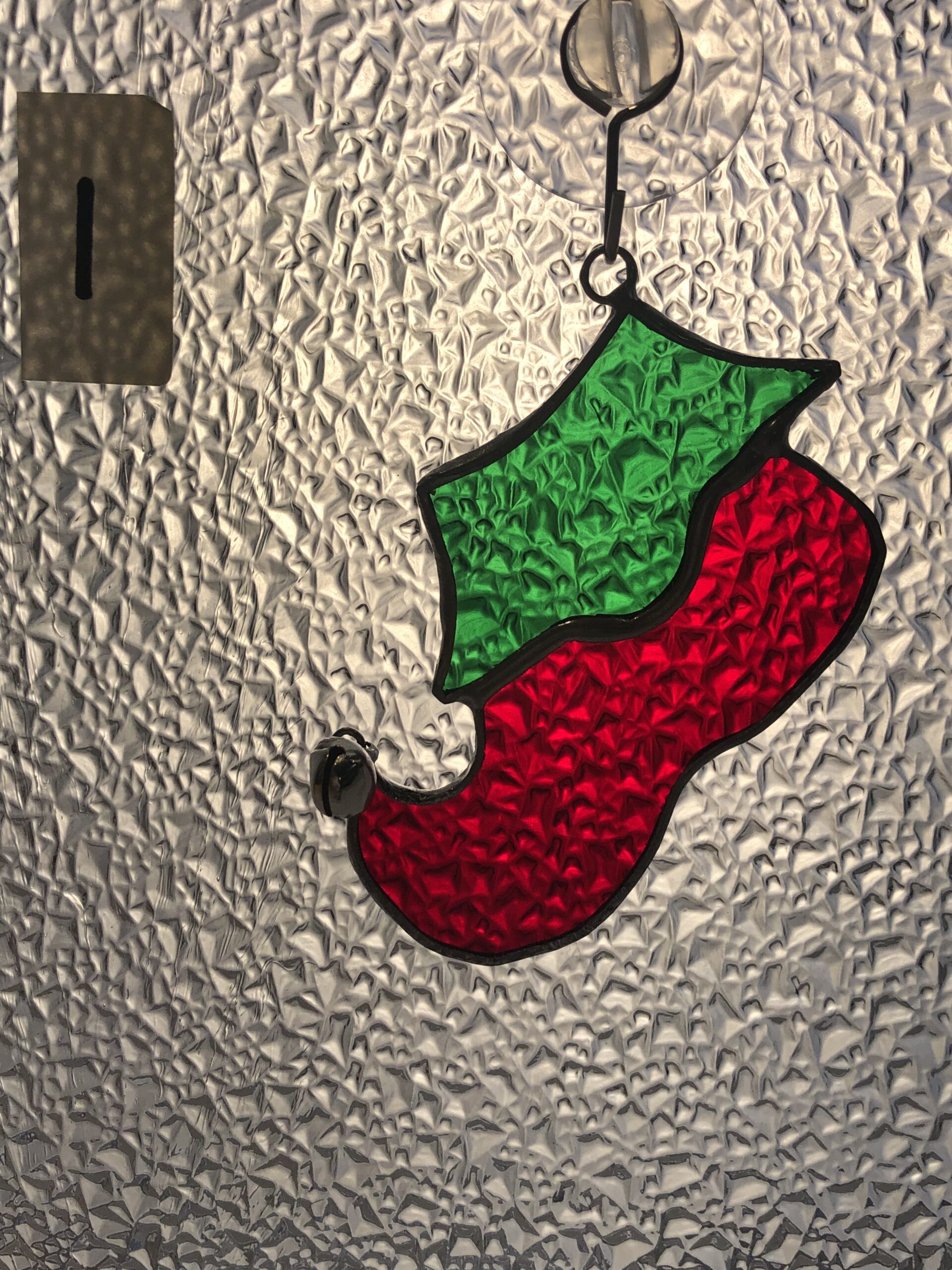 Glasinlood kabouter schoen hanger. Een sprookje, winter of kerst. Tiffany glas in lood. Volledig handgemaakt. Deze schoen is groen en rood transparant glas met een kerst belletje aan de punt. Een leuk kado als kerstboom, raam of deurhanger.