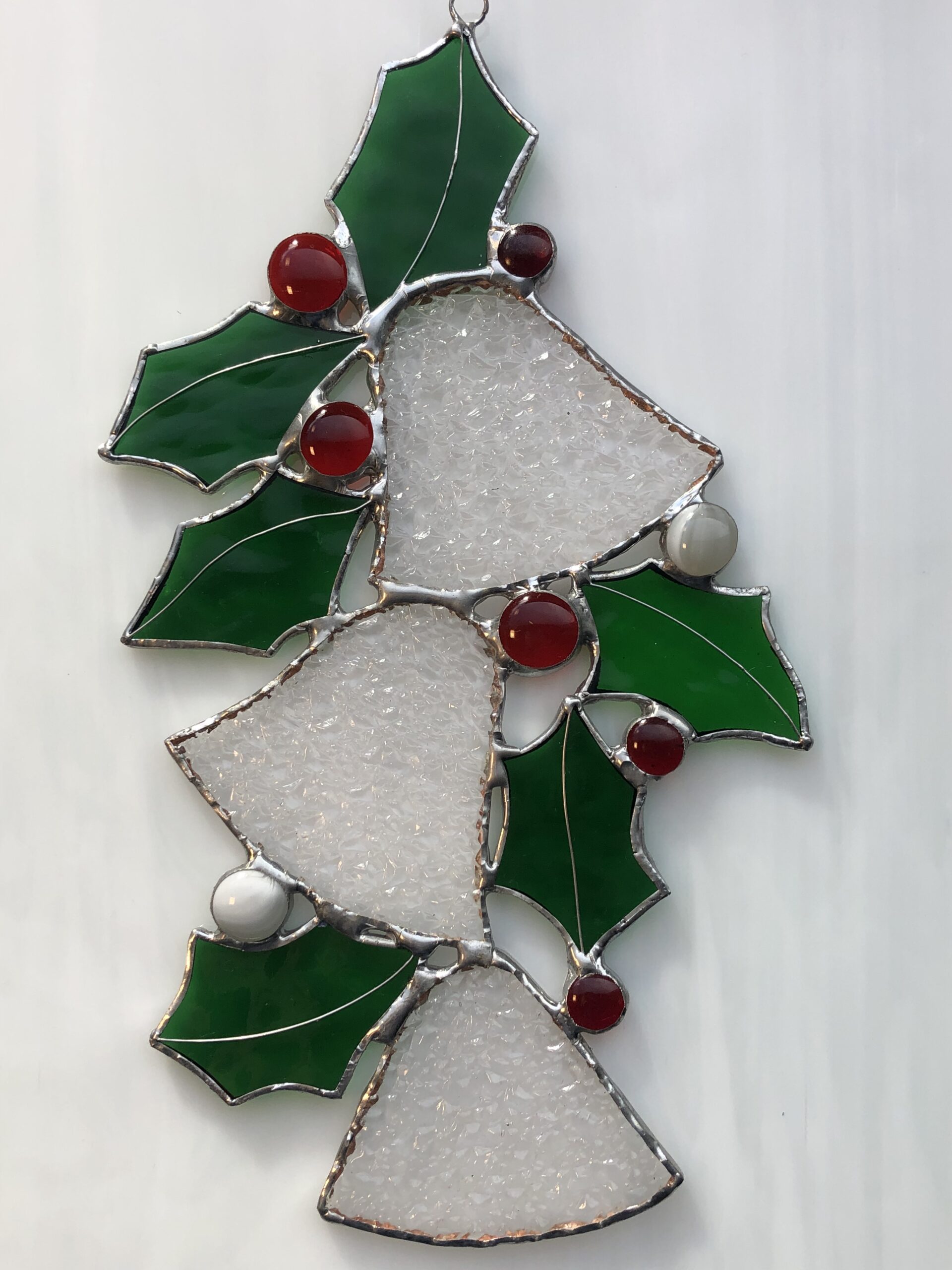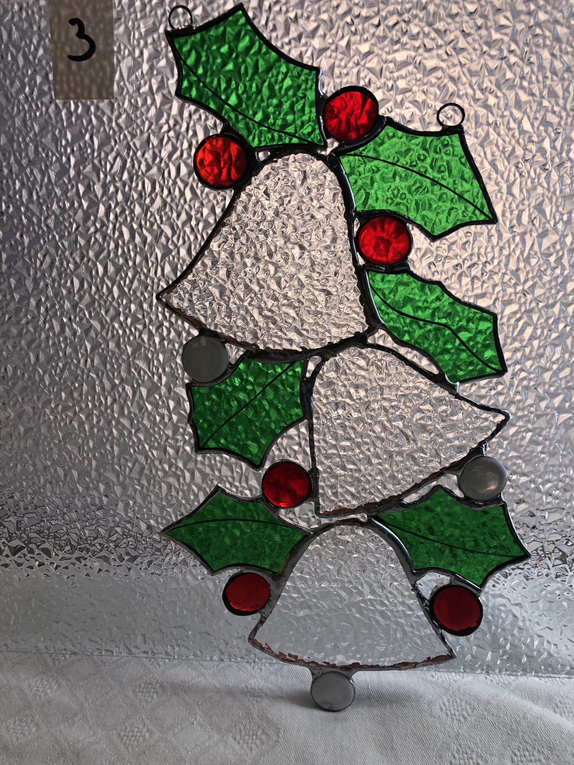 Glasinlood kerstklokken hanger. Een uniek tiffany exemplaar. Volledig handgemaakt in prachtige kleuren met drie klokken. Deze mag niet ontbreken bij u in de huiskamer. Kan ook mooi gebruikt worden als raam of deurhanger. Elk exemplaar is net weer even iets anders.