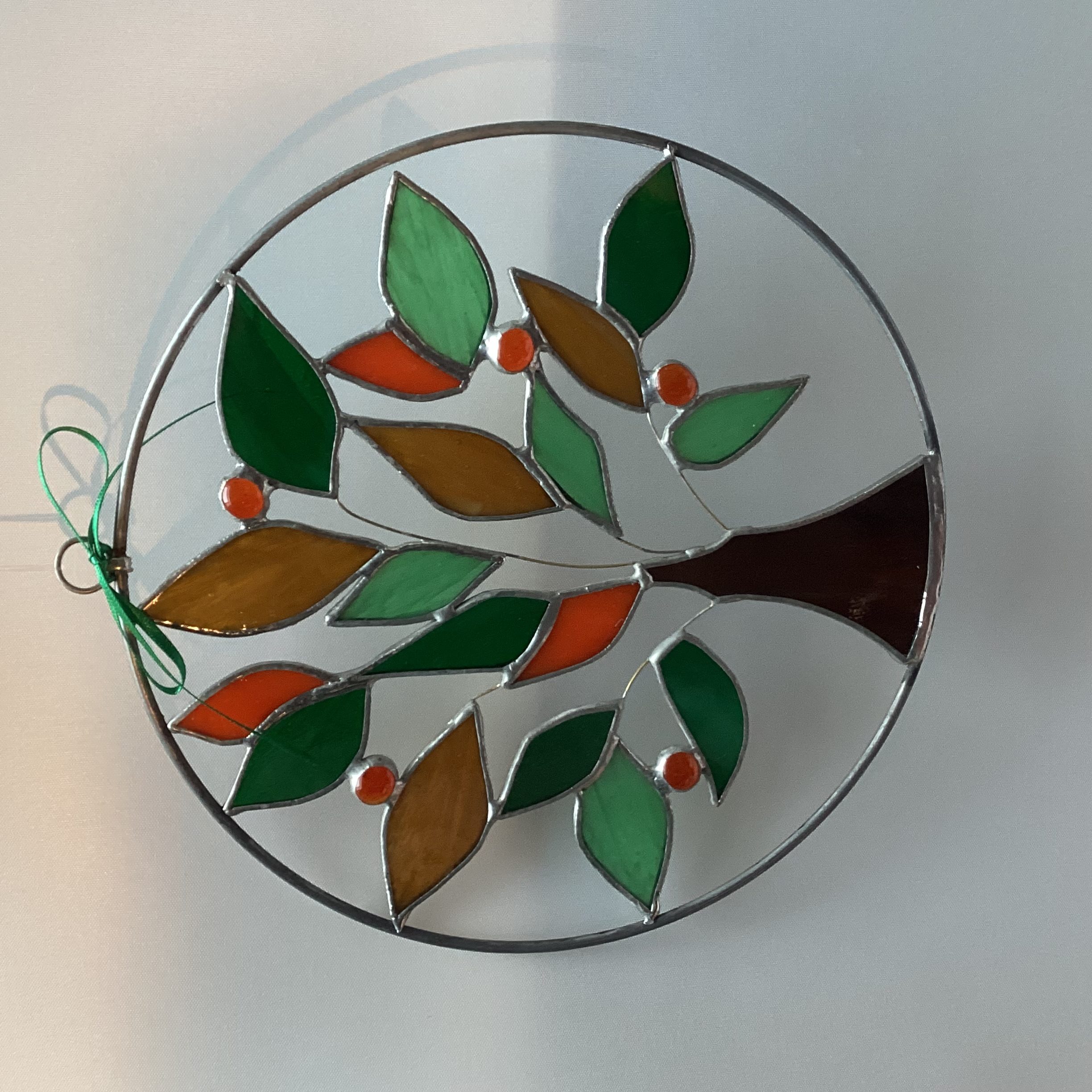Glasinlood levensboom groen. Een groene hanger met speciale bladeren. Een wens boom voor uw kinderen als in een sprookje of voor het seizoen. Een groen gekleurde Tiffany boom hanger. Net even anders dan anders. Volledig handgemaakt. Een unieke boom in mooie groenen tinten met oranje accenten.