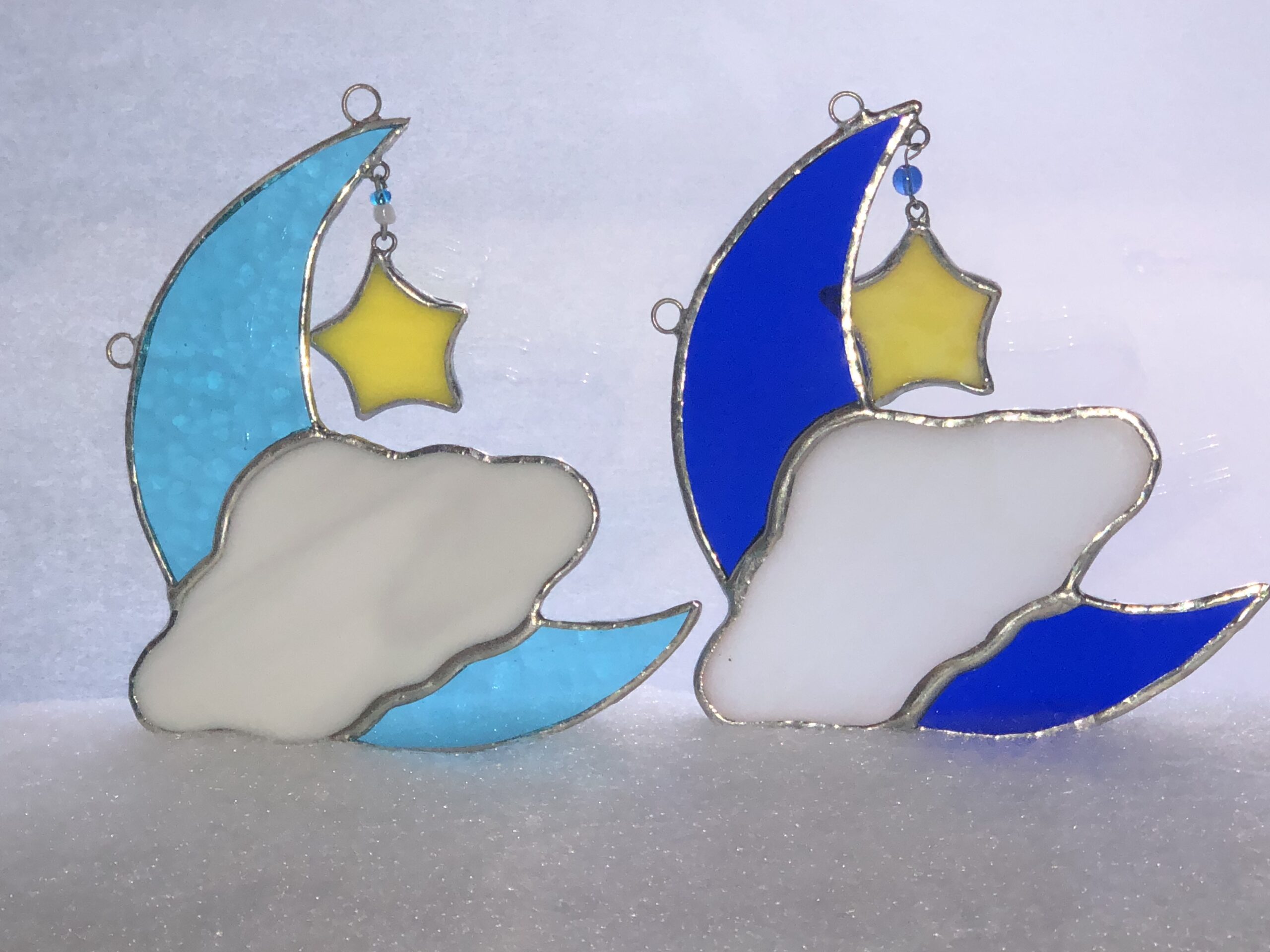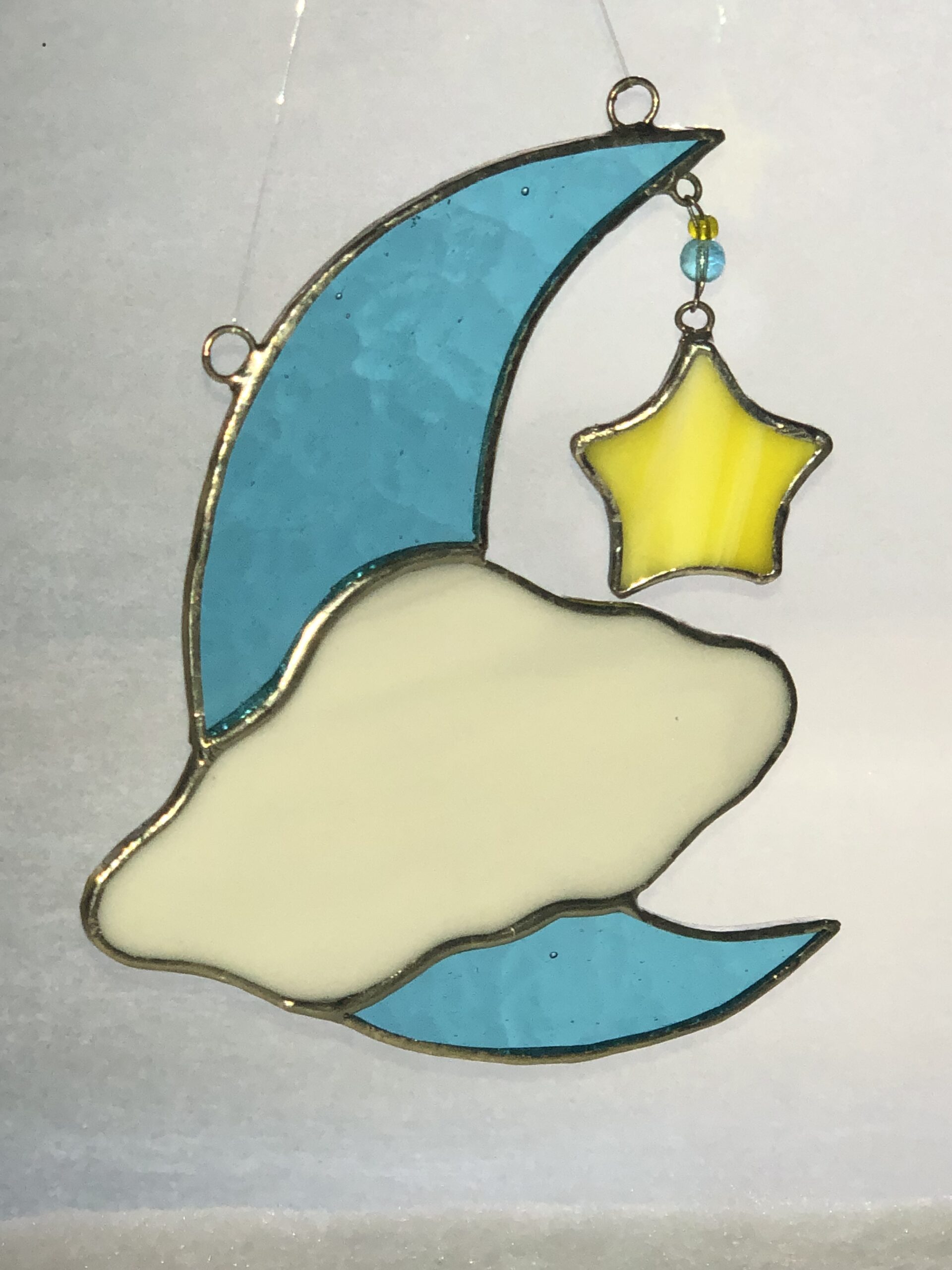 Glasinlood maanhanger licht blauw. Uitgevoerd In de mooie kleur lichtblauw met een gele ster half achter een wolk.Volledig handgemaakte maanhanger. Een leuke en originele aanwinst voor uw kinderkamer, zolder of slaapkamer. Bent u een liefhebber van de sterrenhemel breng de sfeer bij u in huis met deze maanhanger.