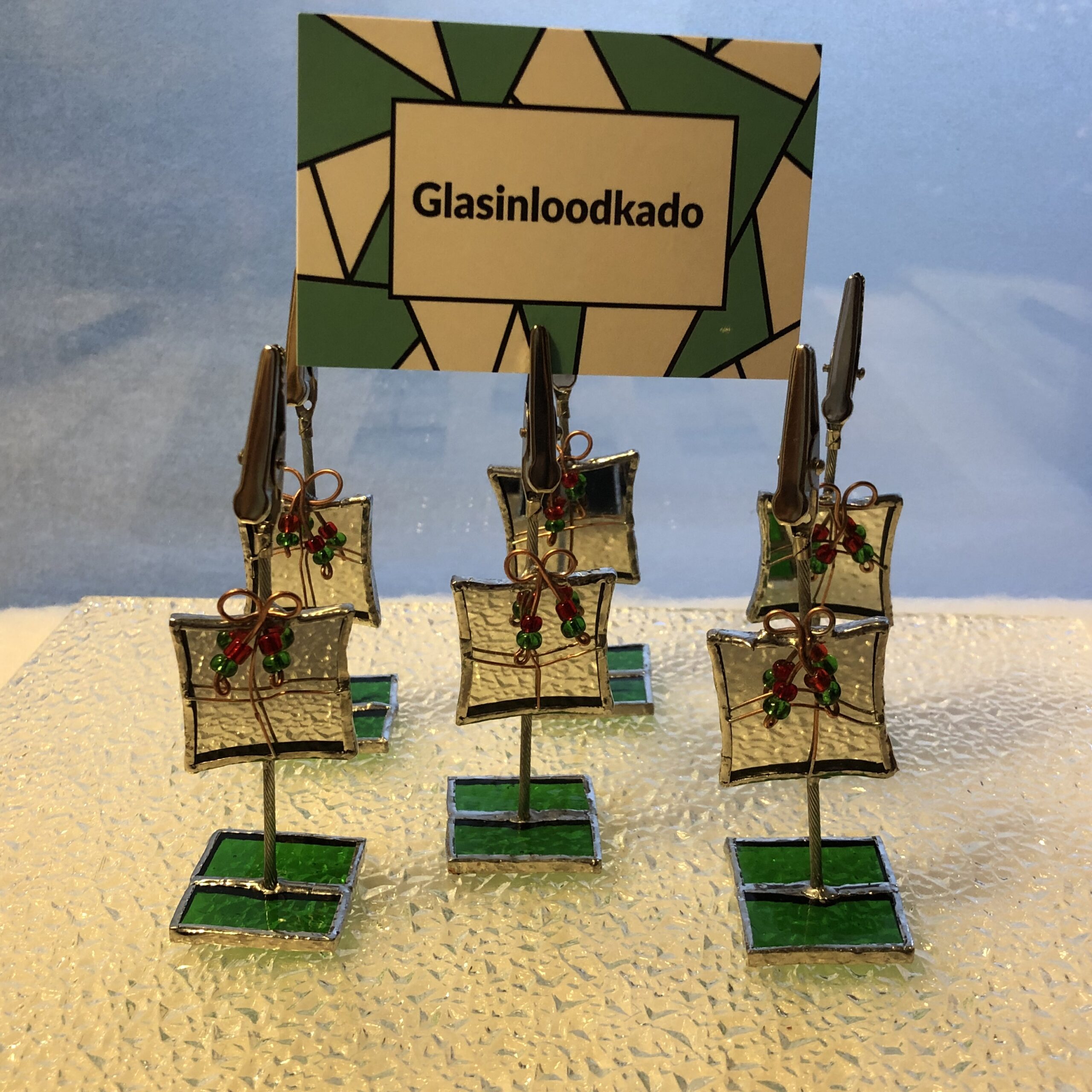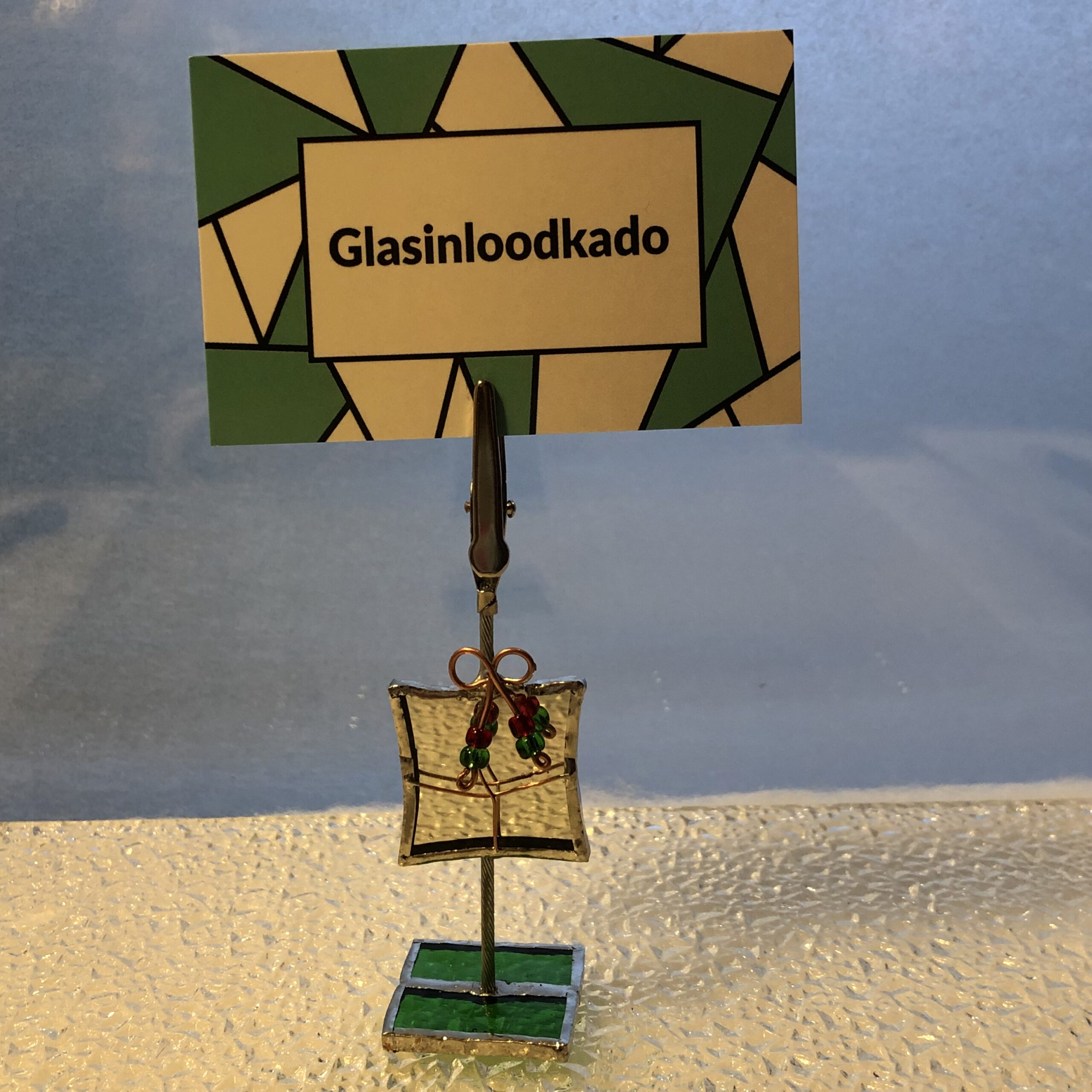 Glasinlood kaarthouder kado spiegel. Super handig voor een verjaardag of diner naast uw bord. Een naam, foto of kaarthouder om te plaatsen in stijl. Dit zijn handgemaakte tiffany exemplaren. Een uniek glas in lood kado voor al uw herinneringen, foto’s en veel meer toepassingen natuurlijk.