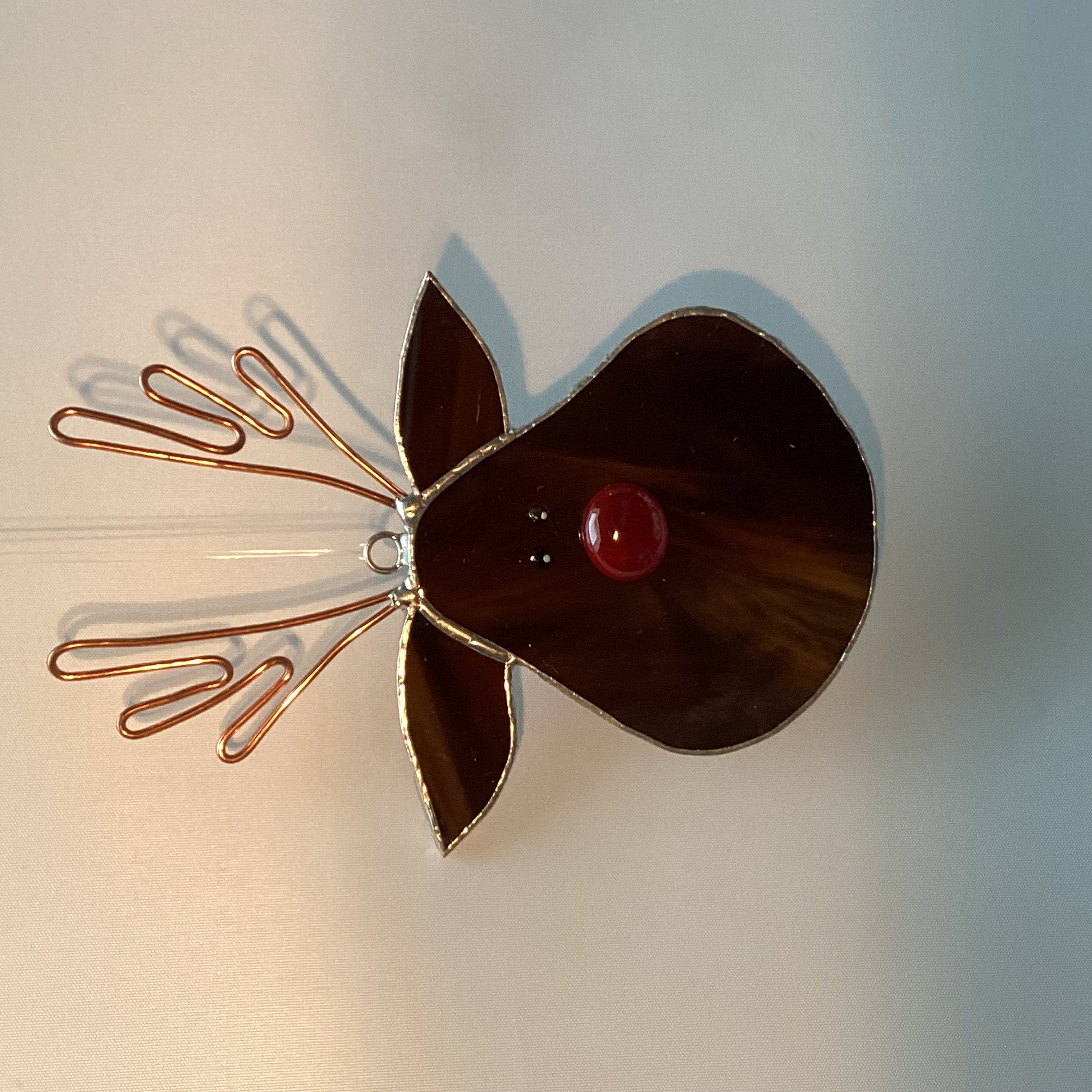 Mooie stoere rendier kop met een rode nugget neus als raamhanger.