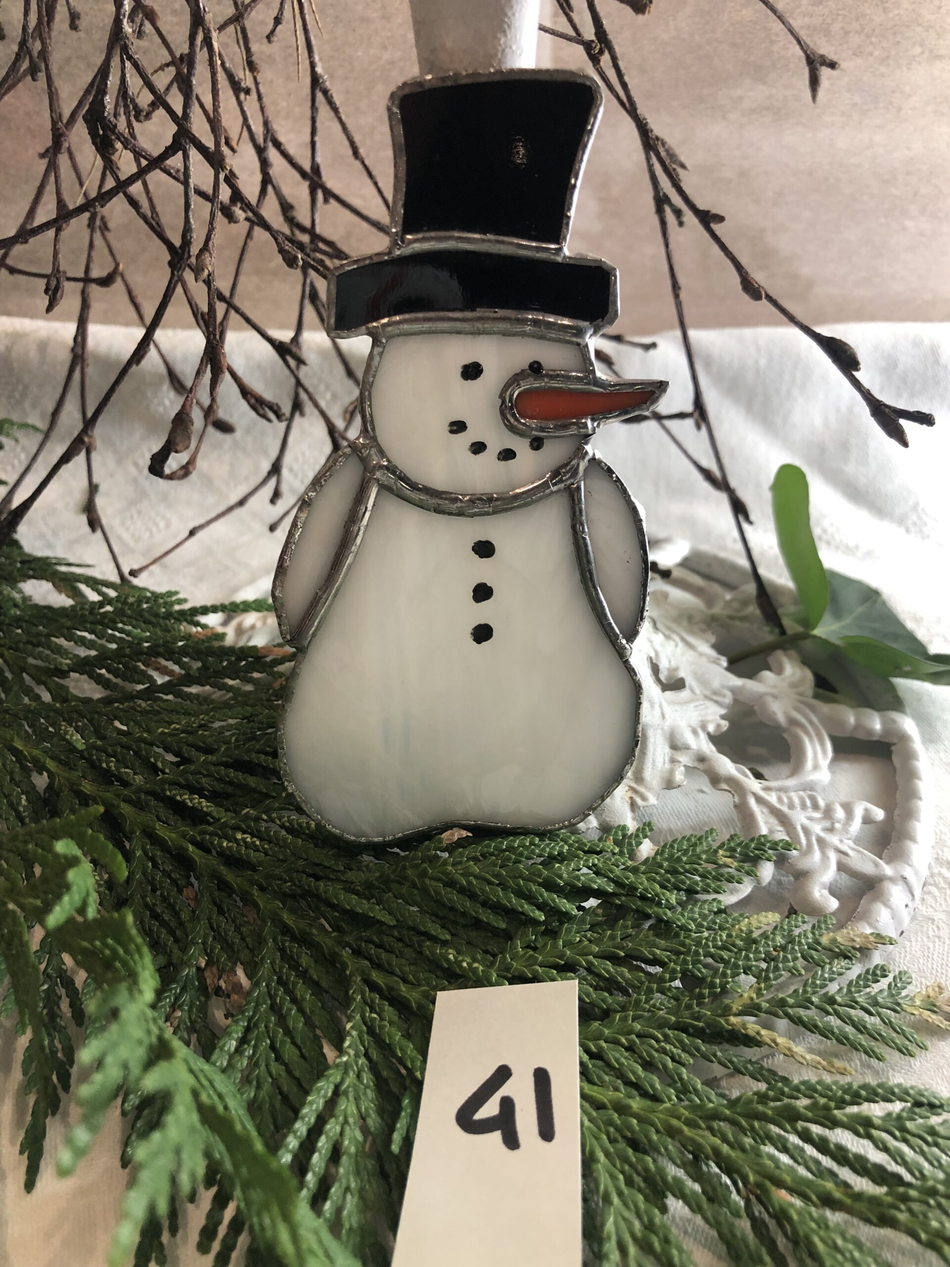 Een glasinlood sneeuwpop. Deze mag niet in uw collectie ontbreken. Volledig handgemaakt Tiffany sneeuwpop. Deze kan neergezet worden maar ook hangen. Leuk voor de winter en past bij ieder interieur. We hebben meerdere exemplaren.