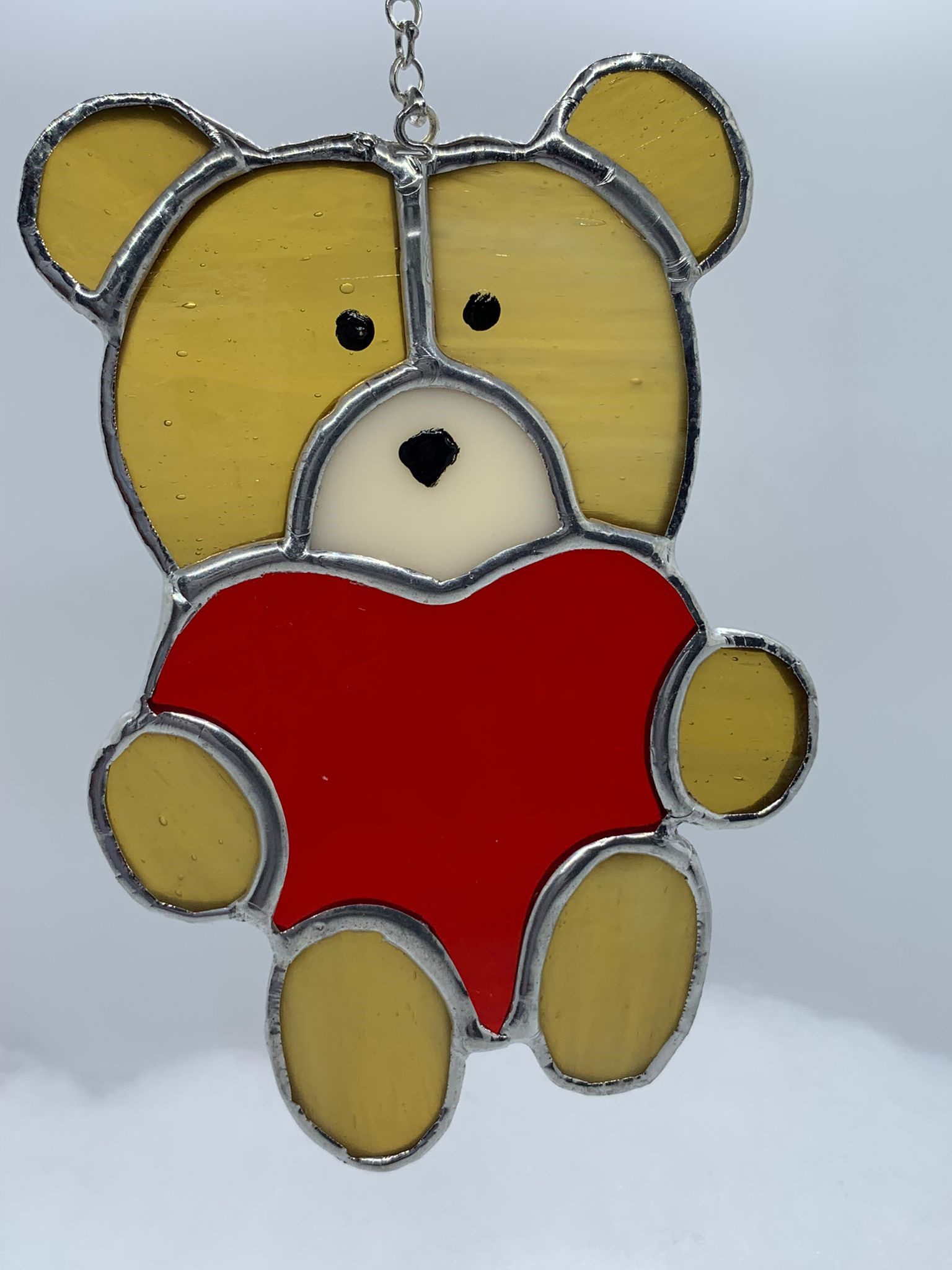 Een glasinlood teddybeer hanger. Een teddybeer als glas in lood knuffel hanger met zijn lichaam als rood hart. Een kado met liefde handgemaakt voor een verjaardag of valentijnsdag voor uw partner in de slaapkamer of voor uw kinderen in de kinderkamer.