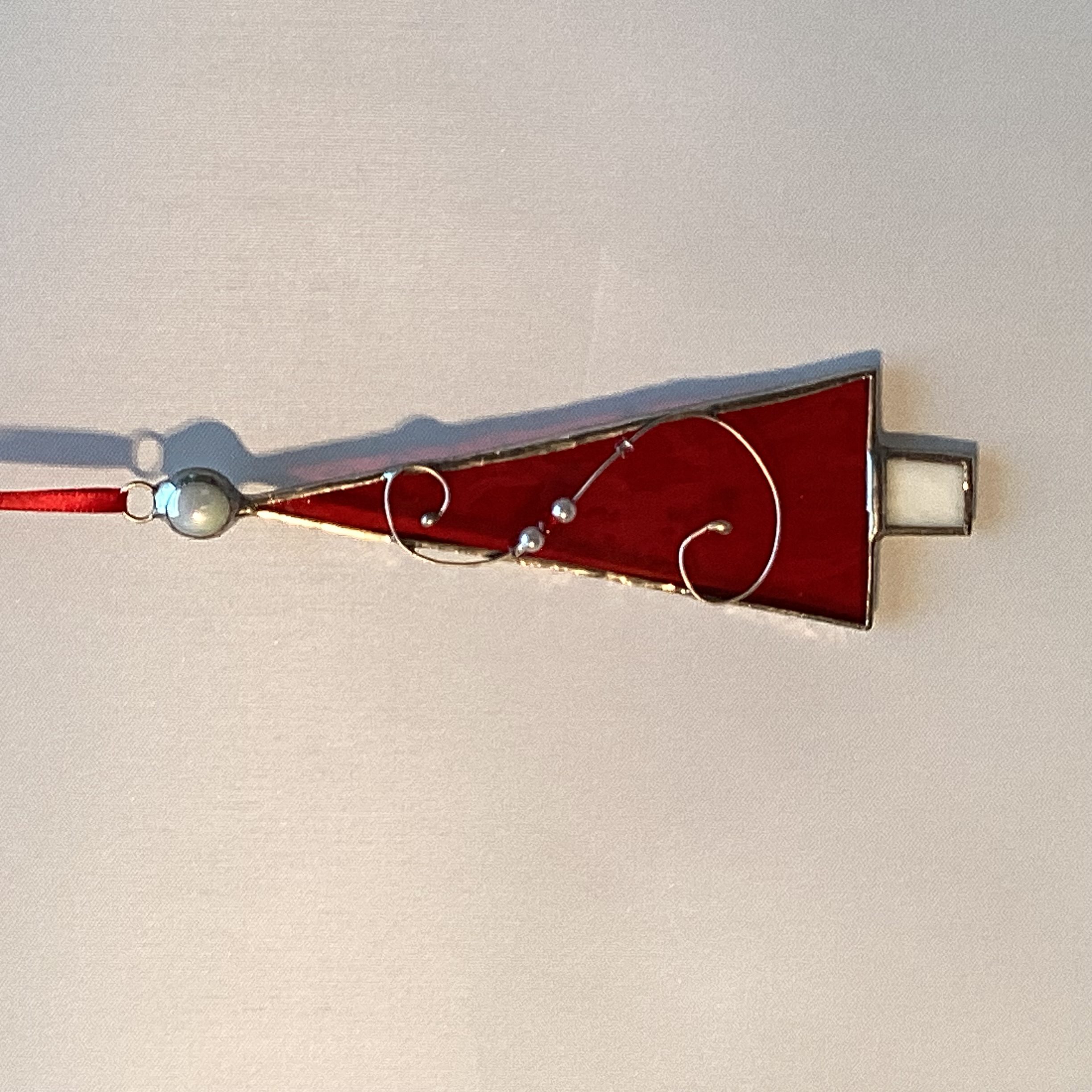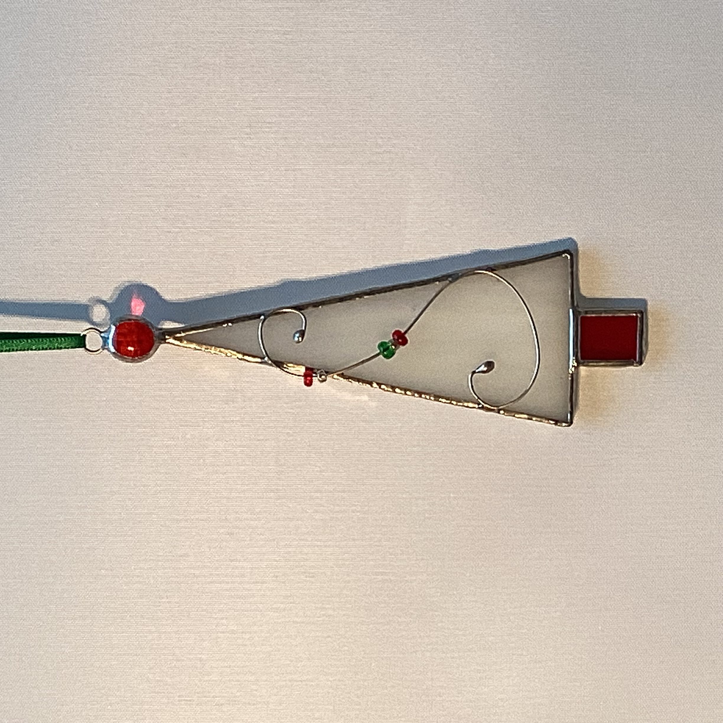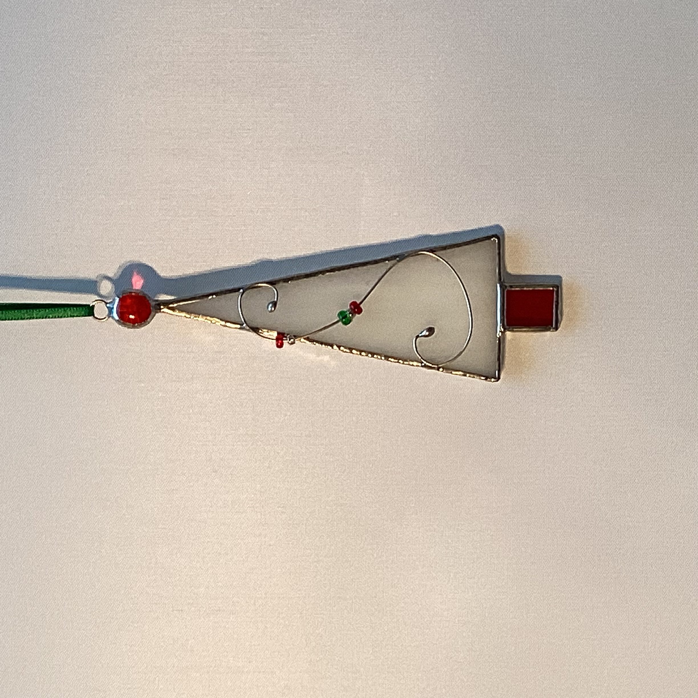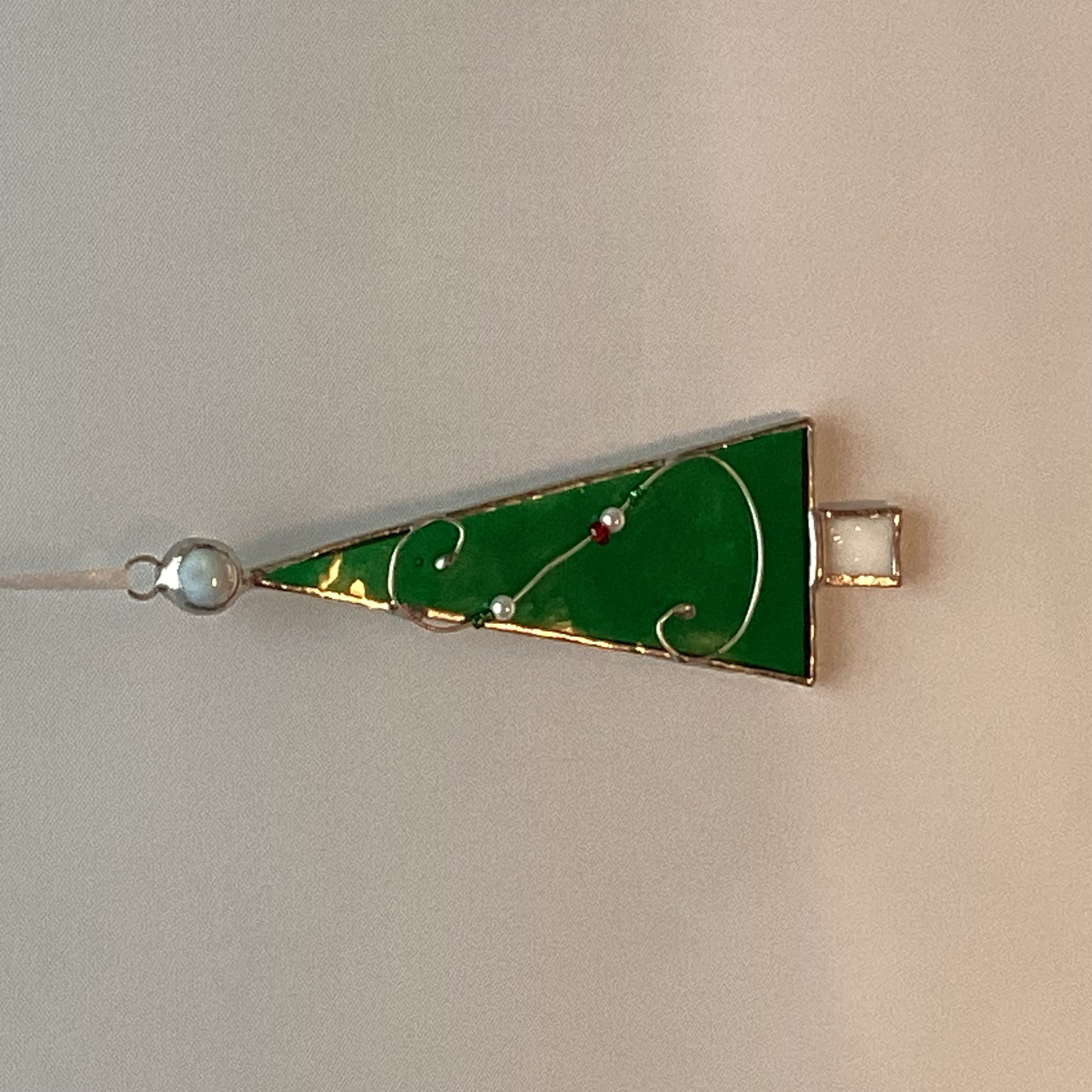 Glasinlood Witte Kerstboom met kralen. Mooie witte kerstboomhanger met slinger en bal in de top. Een uniek handgemaakt glasinloodkado voor de feestdagen. Wij hebben meerdere soorten en kleuren kerstbomen in onze glasinloodkado webshop.