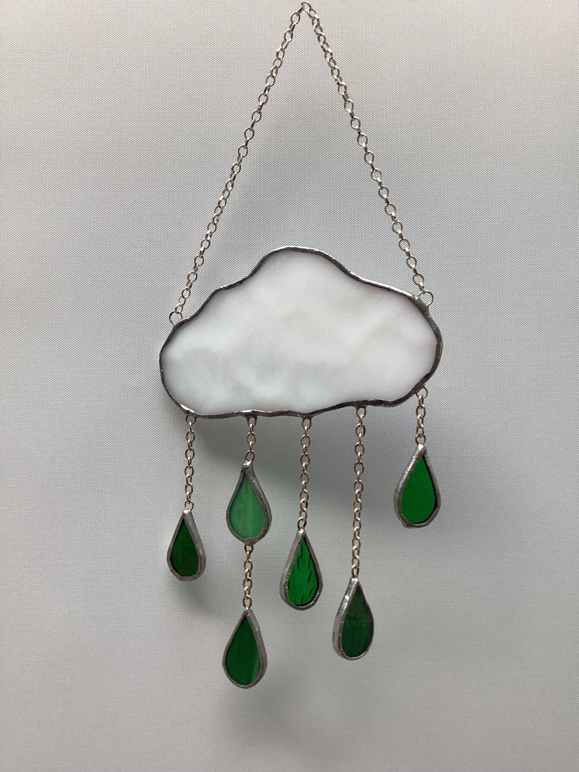 Glasinlood witte wolk met gekleurde groene druppels. Het is een originele glasinlood hanger voor de herfst die in het zonlicht een prachtig effect geeft in uw kamer. Na regen komt zonneschijn.