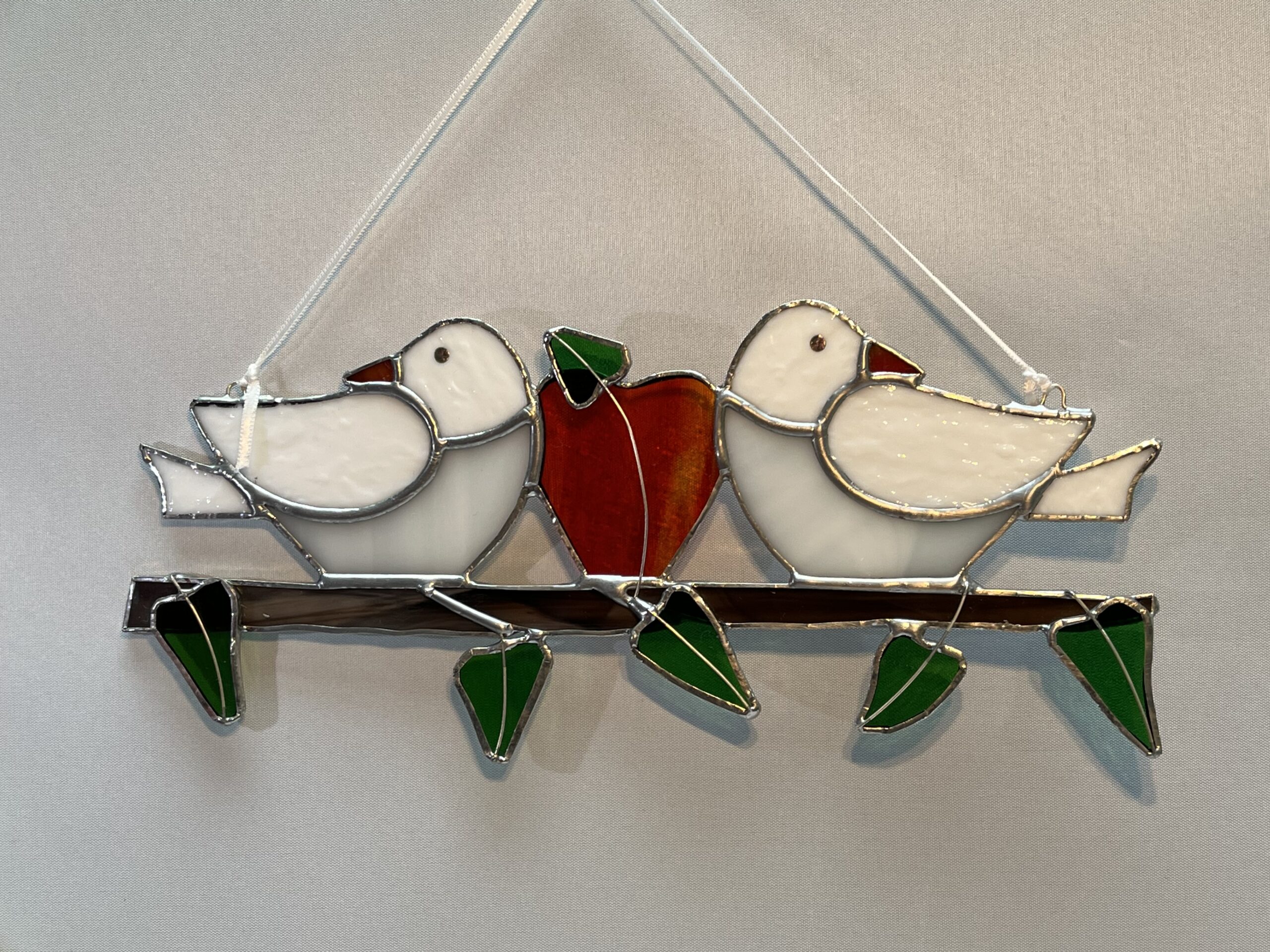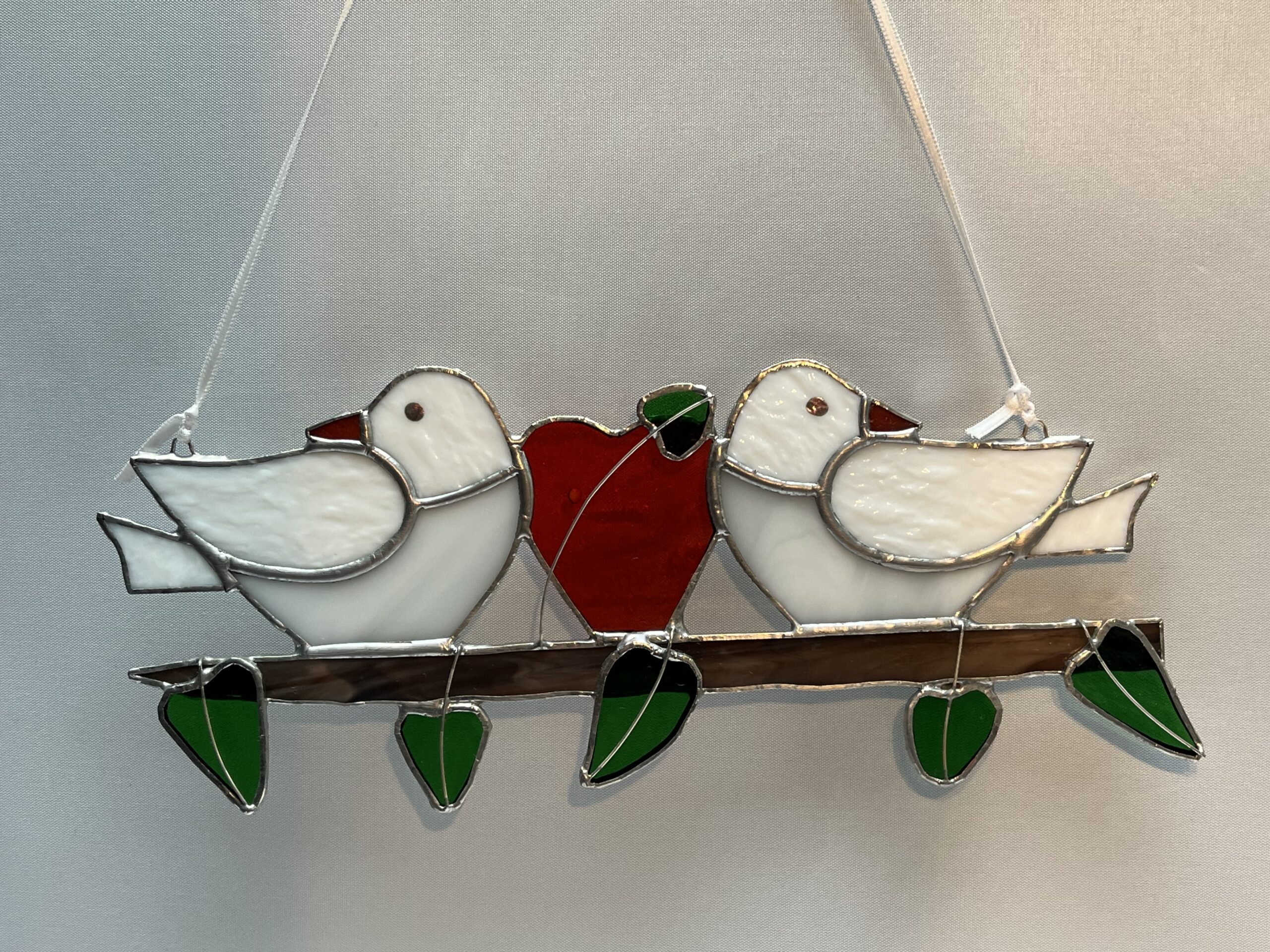 Glasinloodkado duiven op een tak. Twee tortel duiven op een tak met een hart. Duiven een signaal voor de vrede. Of een leuk kado om weg te geven aan een verliefd stel of aan je partner op een speciale dag.