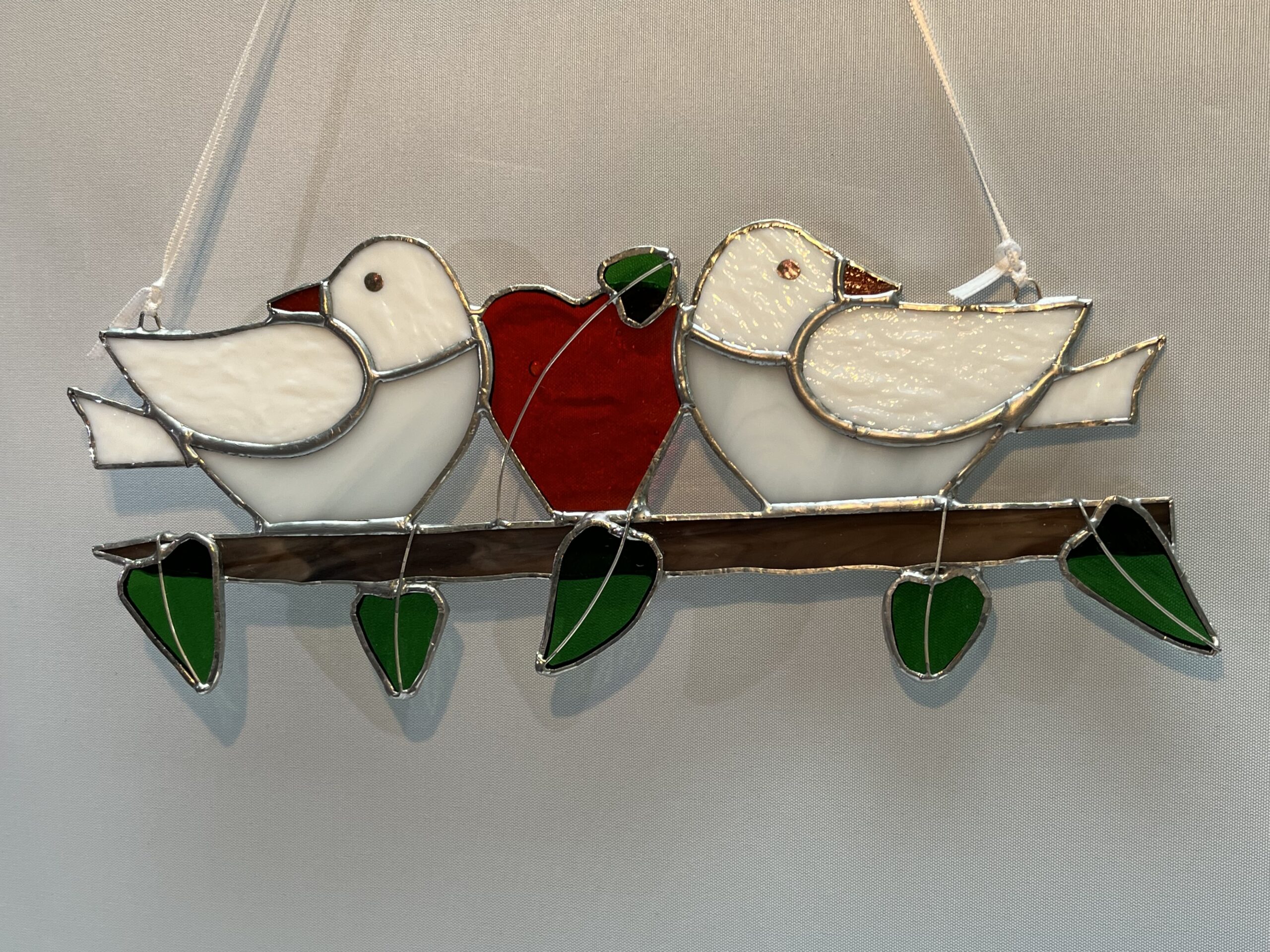 Twee tortelduiven op een gebroken tak met een rode hart.Een leuk kado om weg te geven aan een verliefd stel.