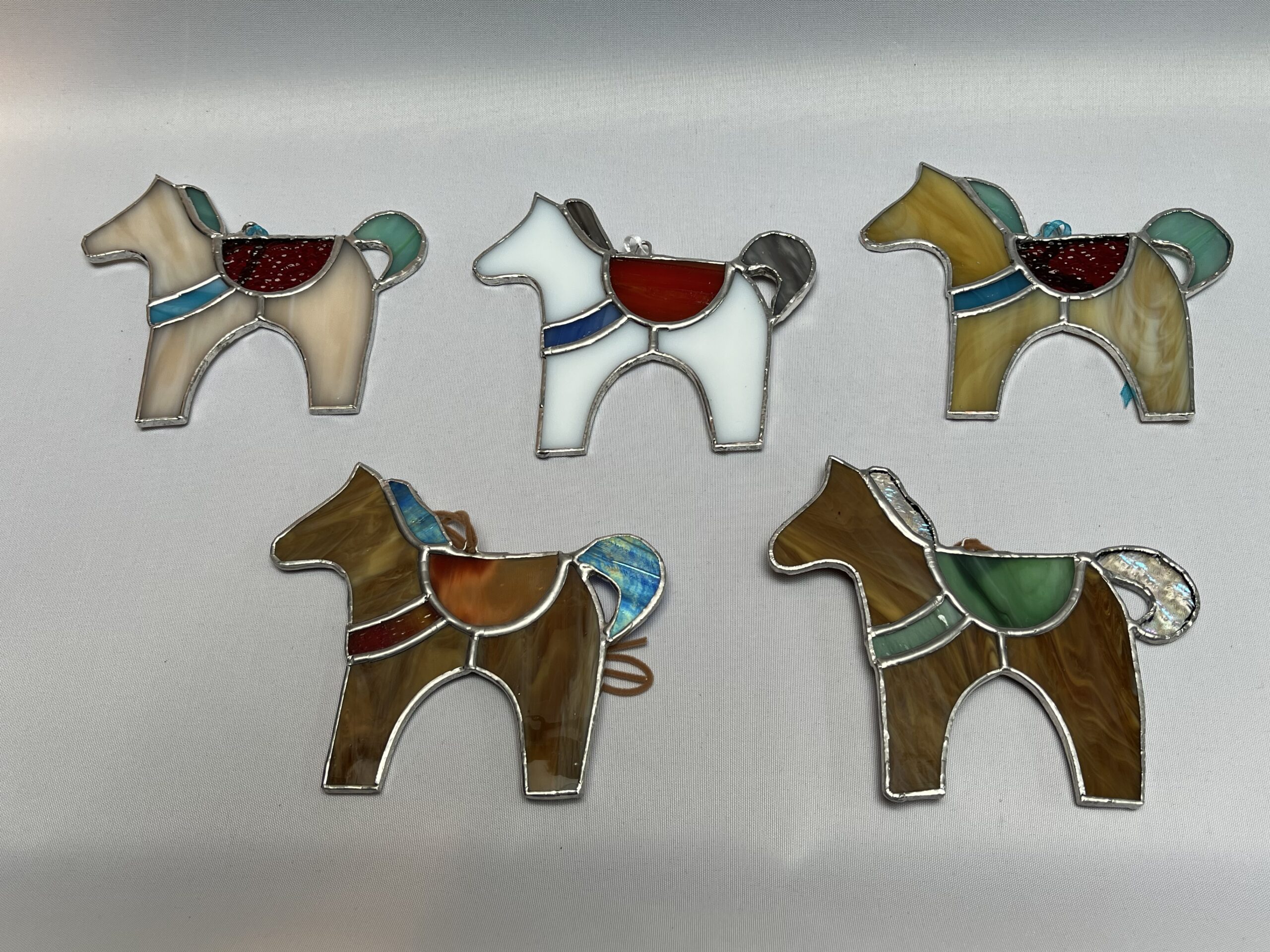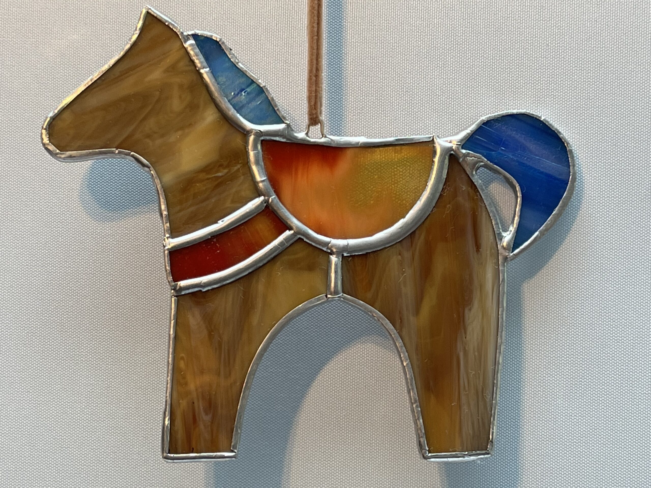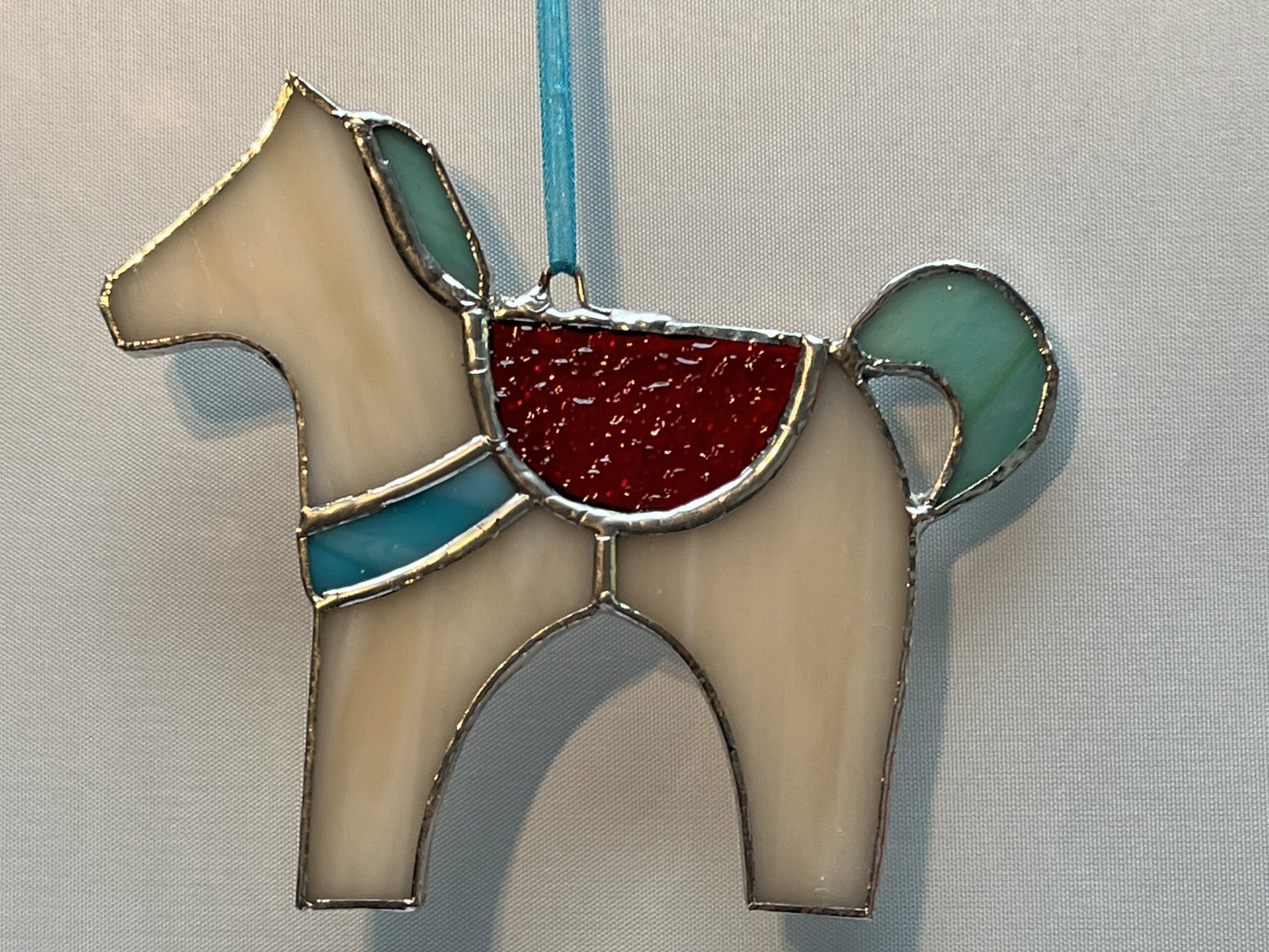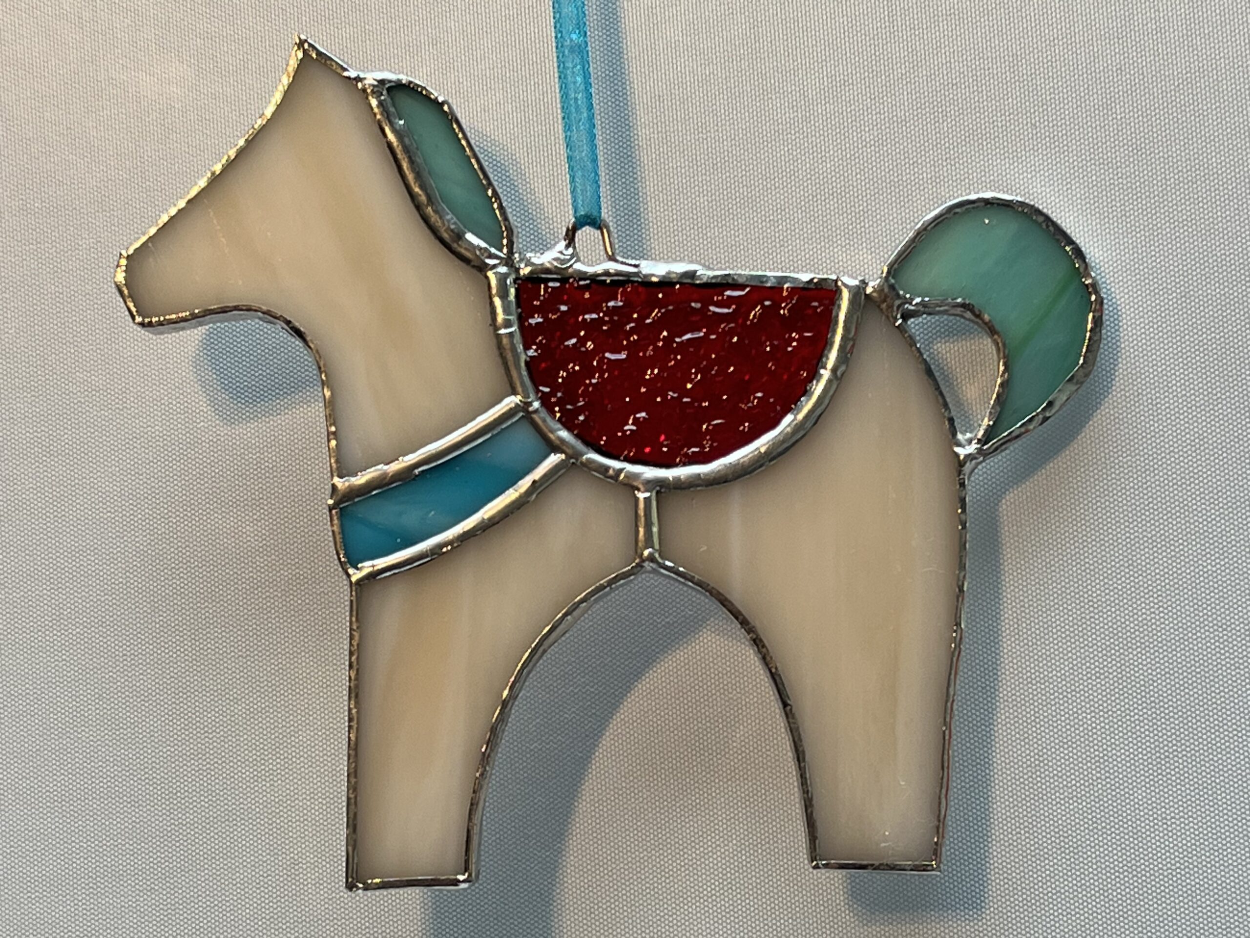 Glasinloodkado Paardenhanger met een rood transparant zadel. Een licht beige paardenhanger met een rood transparant zadel, aqua manen en zeegroene staart. Echt een leuk kado voor een paardenliefhebber of voor Sinterklaas. Wij hebben meerdere kleuren paarden en zadels.