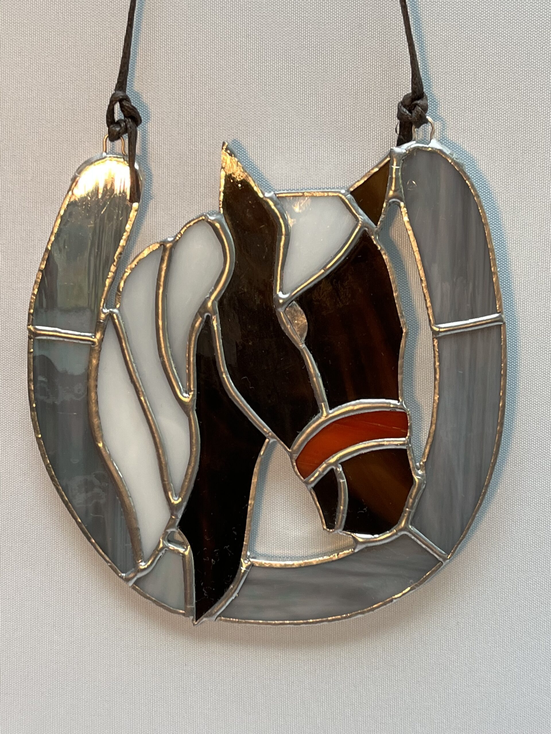 Glasinloodkado Paardenhoofd in hoefijzer. Een glanzend grijs hoefijzer met daarin een bruin paardenhoofd met mooie witte manen. Dit hoefijzer brengt altijd geluk in uw woonkamer, stal, of slaapkamer. Een heel mooi hoefijzer voor een paarden liefhebber of gewoon omdat het een mooi glas in lood kado is.
