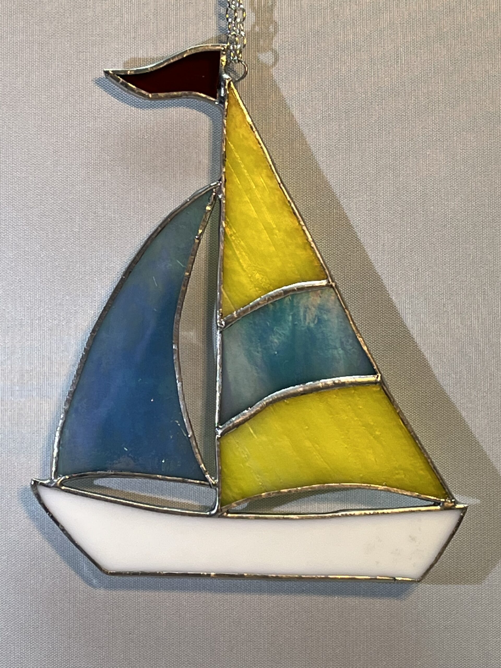 Glasinloodkado Zeilboot met blauwe fok. Mooie witte zeilboot met glanzende blauwe parelmoer kleurige fok en geel en blauwe zeil met rode wimpel. Bent u liefhebber van boten. Deze mag toch in wel een mooi plekje krijgen in uw boot. We hebben meer soorten zeilboten en verschillende kleuren in onze glasinloodkado webshop.
